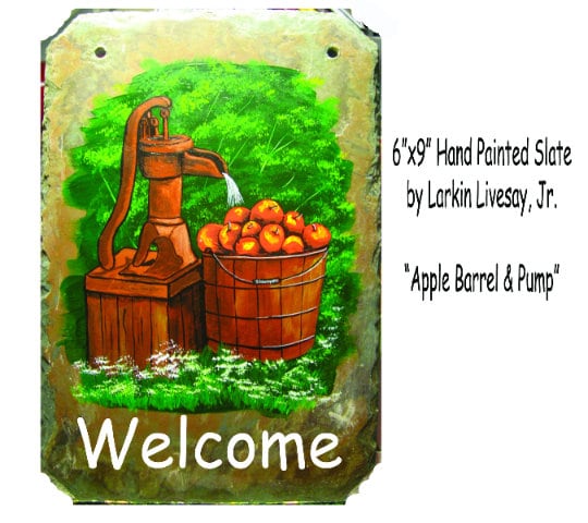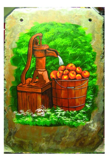 This particular tile is approximately 6" x 9", hand painted Apple Barrel and Pump. There is a space at the bottom for personalization, or can be left blank