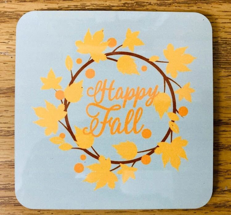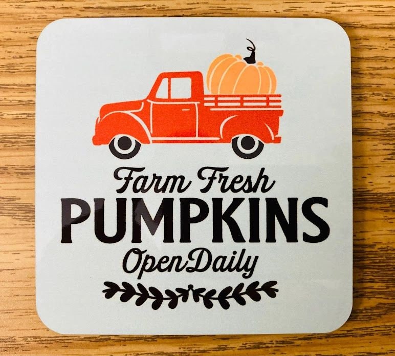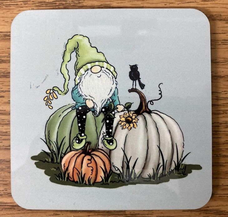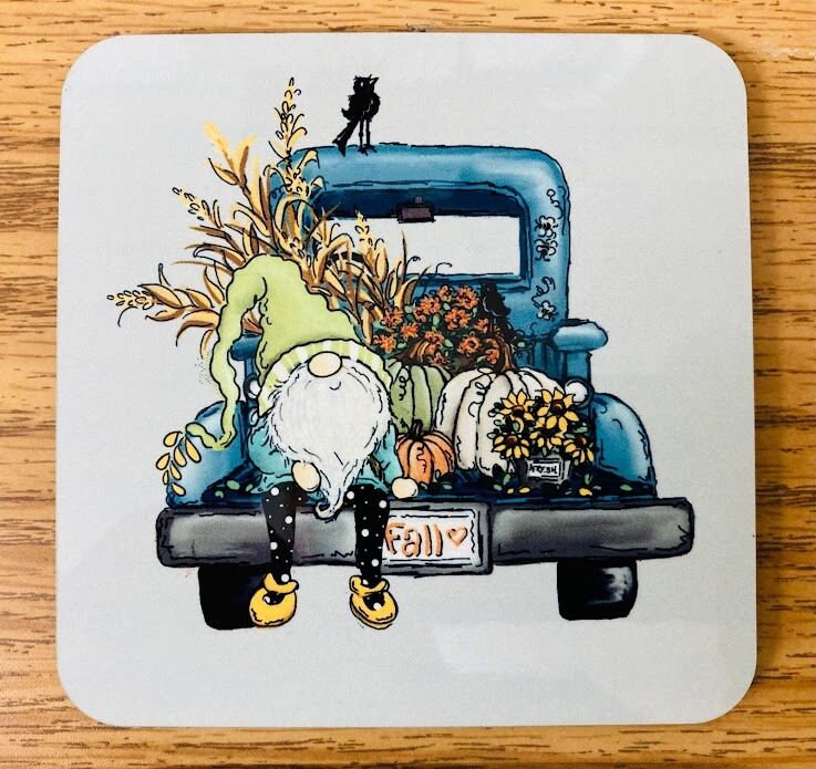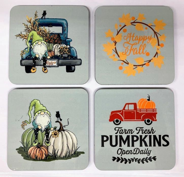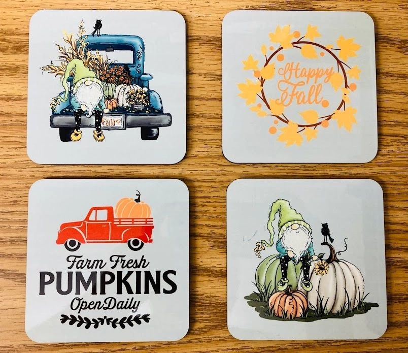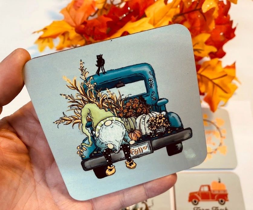 SET OF 4 MATCHING COASTERS, FALL, AUTUMN, PUMPKINS, GNOMES, TRUCK Welcome Fall and your guests with these matching coasters. Approximately 4 inches square with rounded corners, 1/8 inch thick with cork backing. Colors are heat infused into the surface for a scratch resistant and durable finish. Great for Autumn, Thanksgiving, House Warming gifts, Wedding gifts, Christmas presents or simply to add a touch of whimsy to your fall decorations. I can put any design or photos on these coasters, message for info.