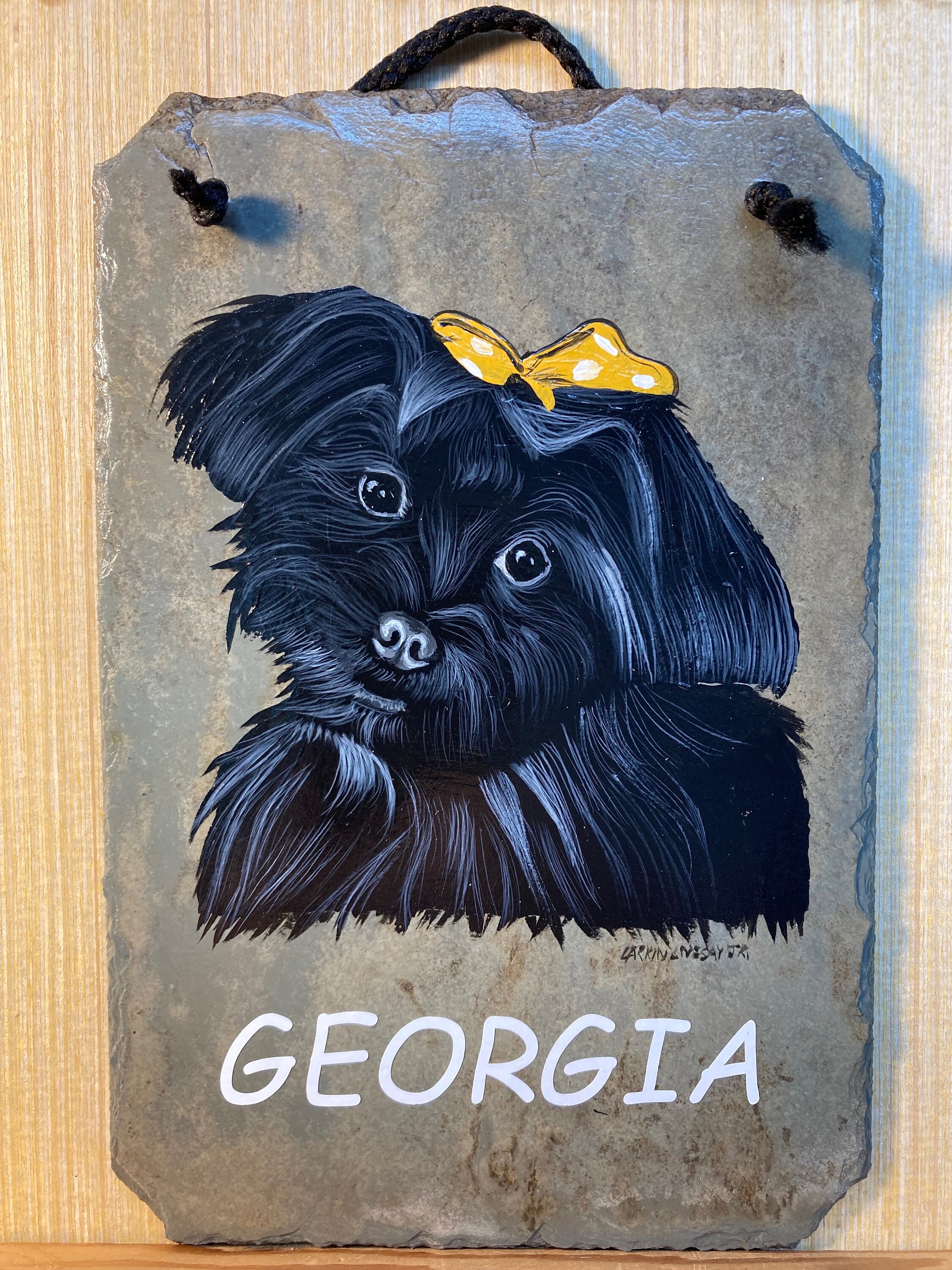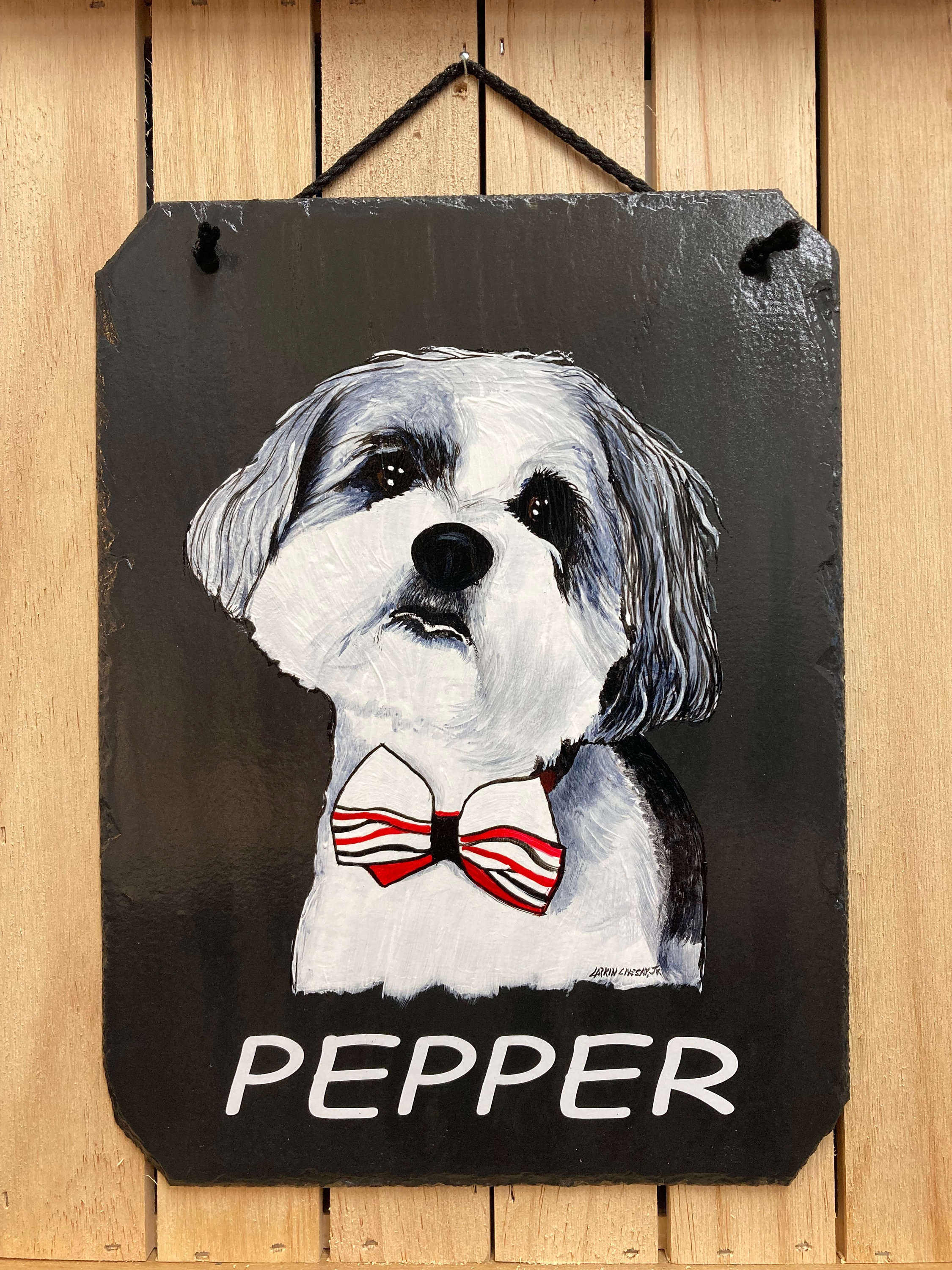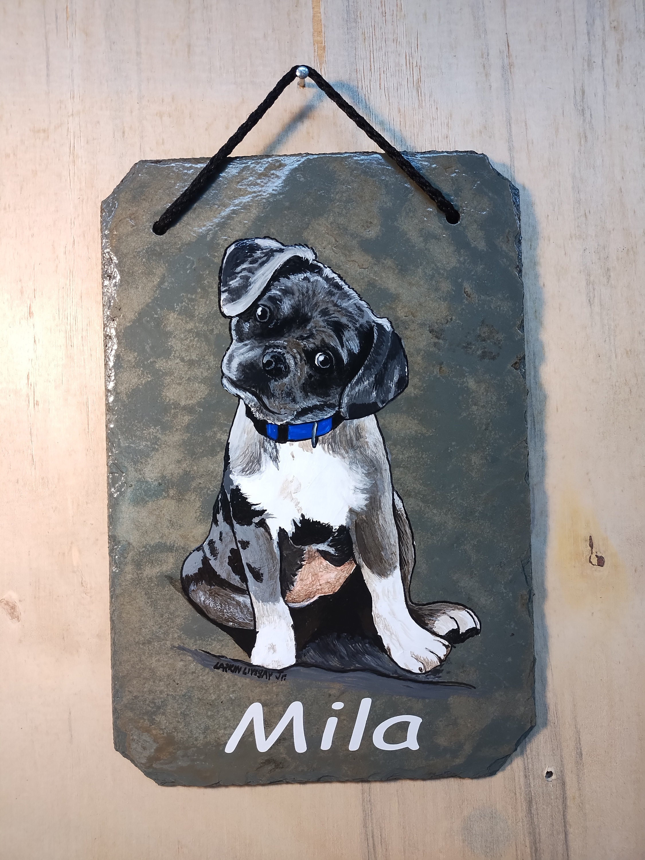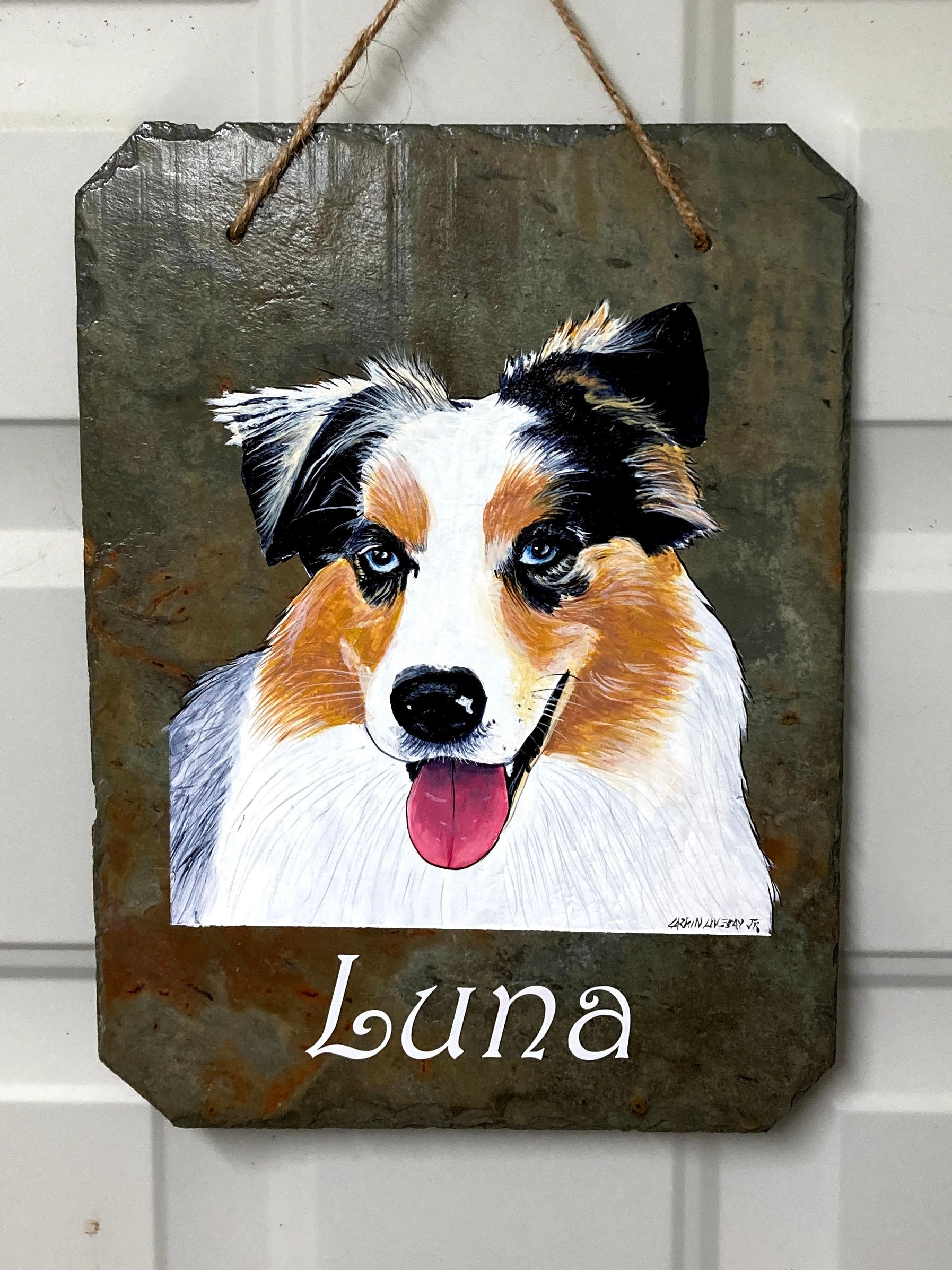 This particular tile is A hand painted portrait of your beloved pet. There is a space at the bottom for personalization, or can be left blank. If you would like 2 animals on the same slate, the slate will be in a horizontal position. These are perfect for showing your love for your fur babies as well as a memorial for your sweet friend.