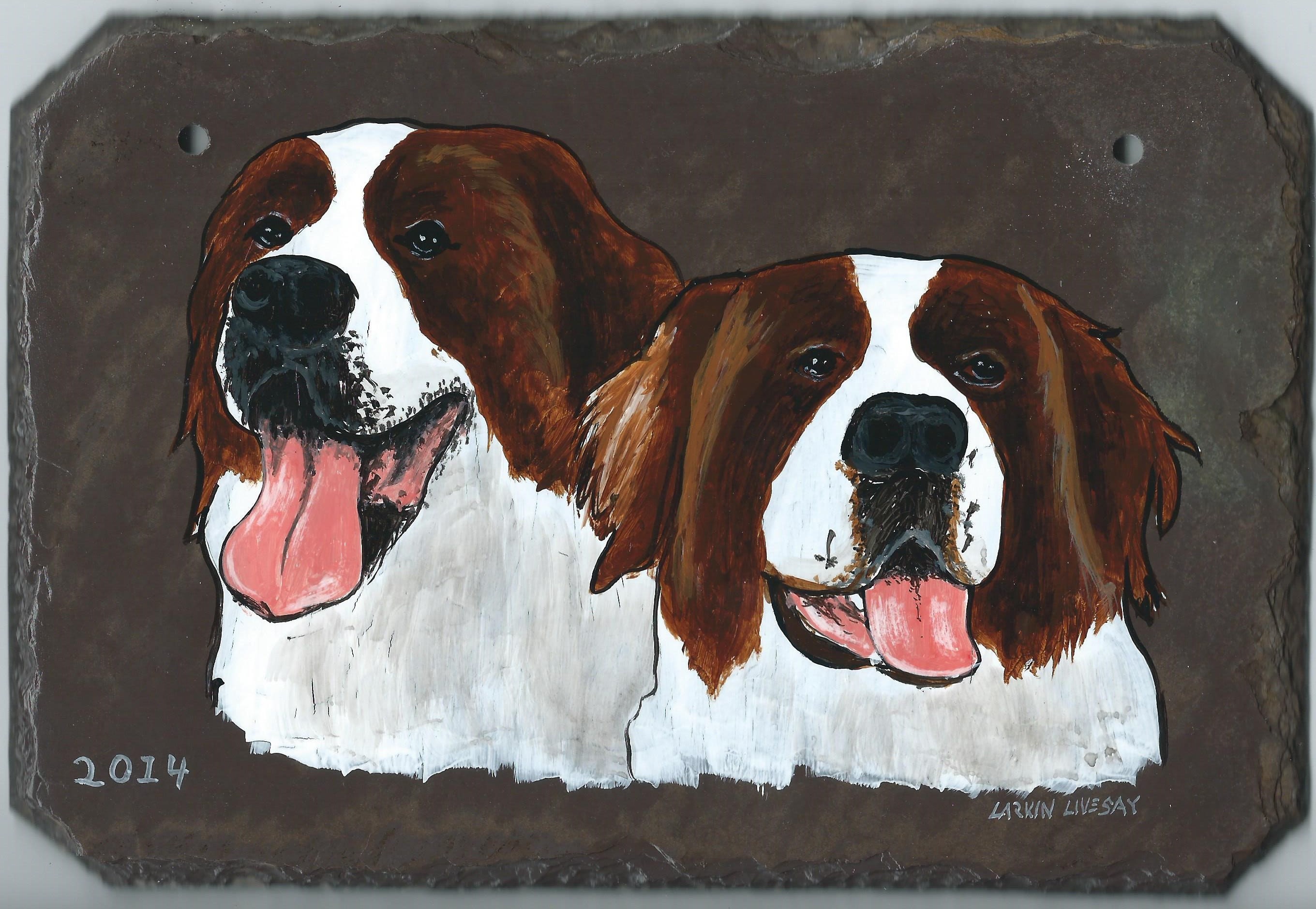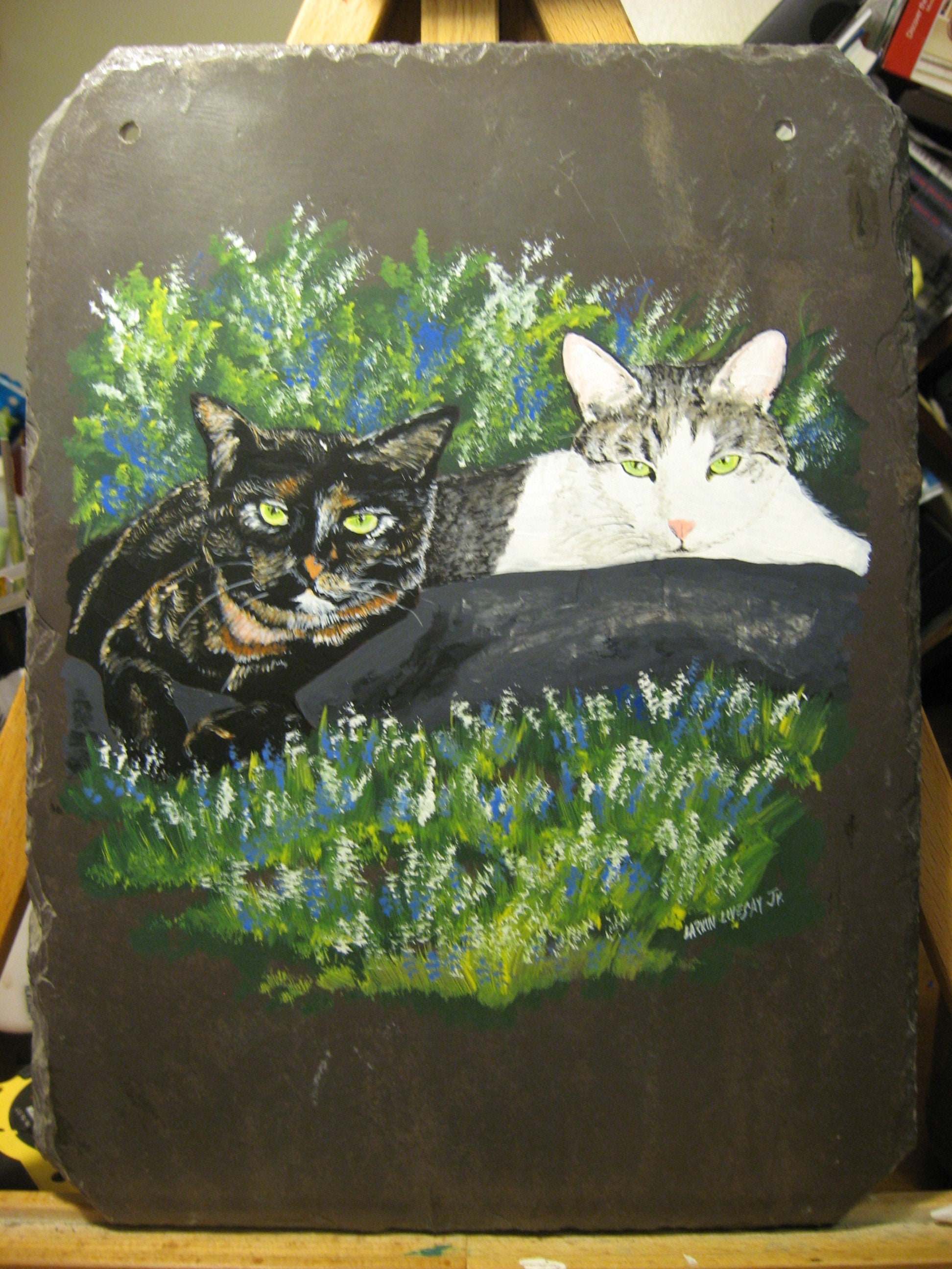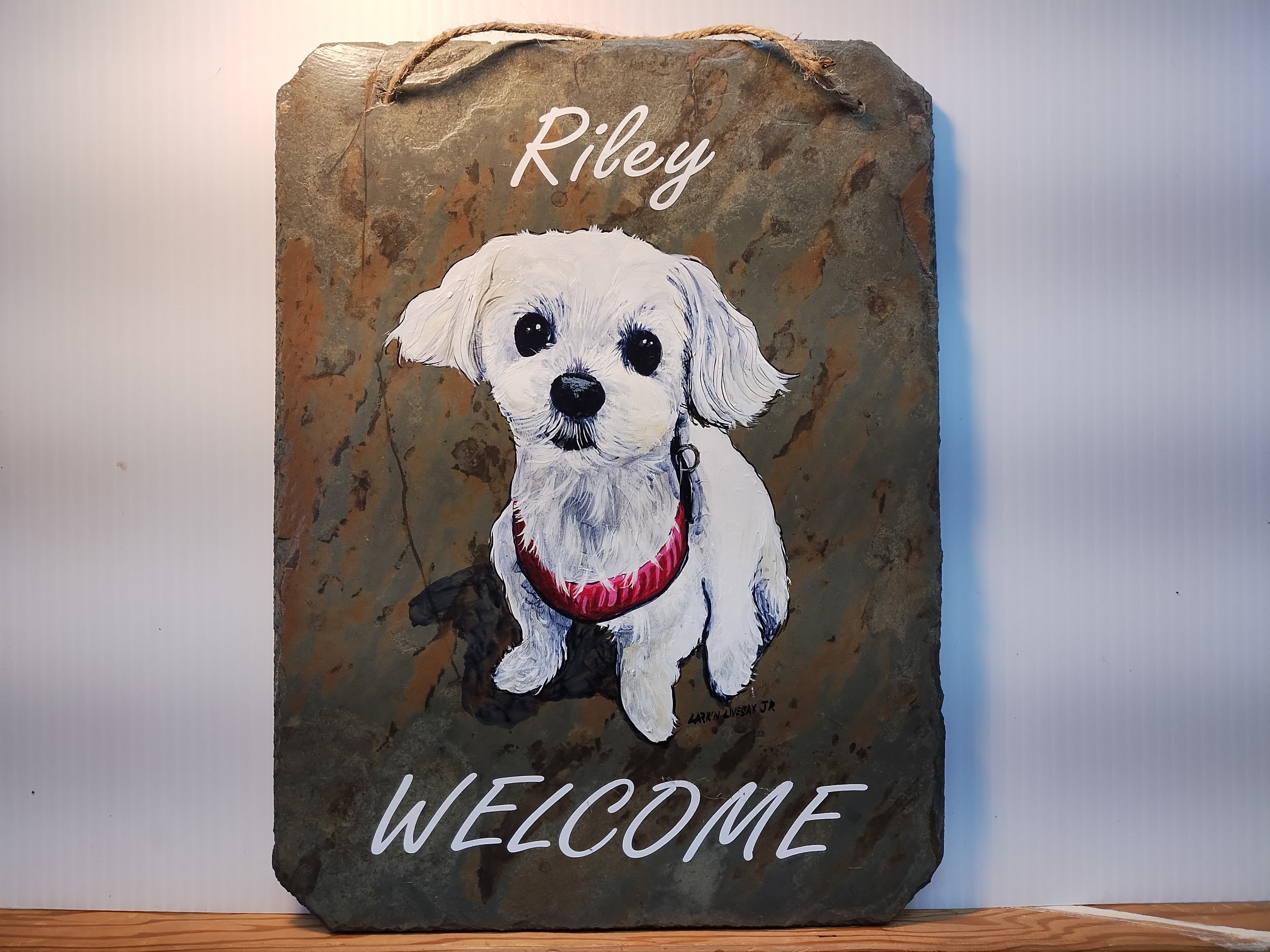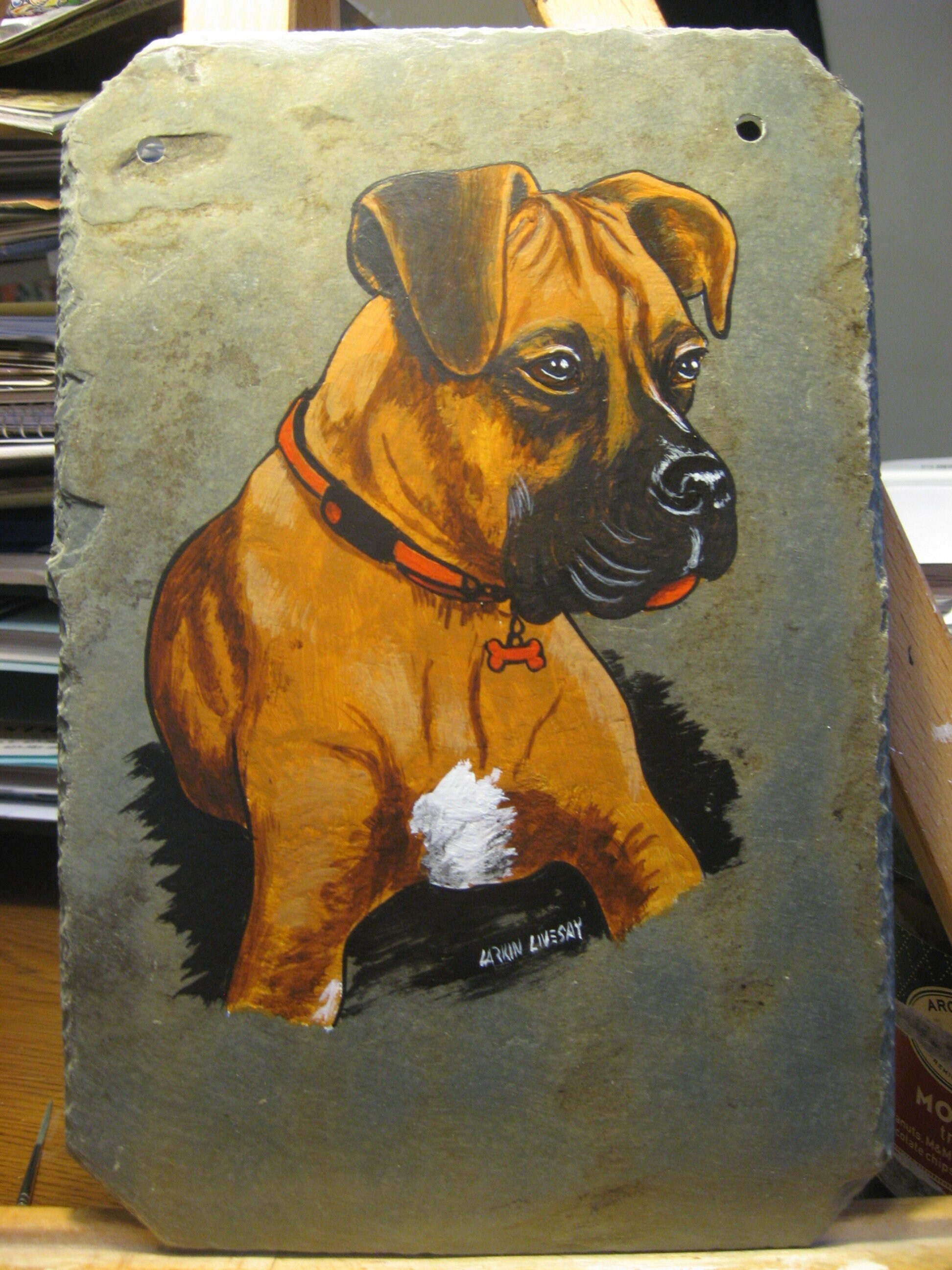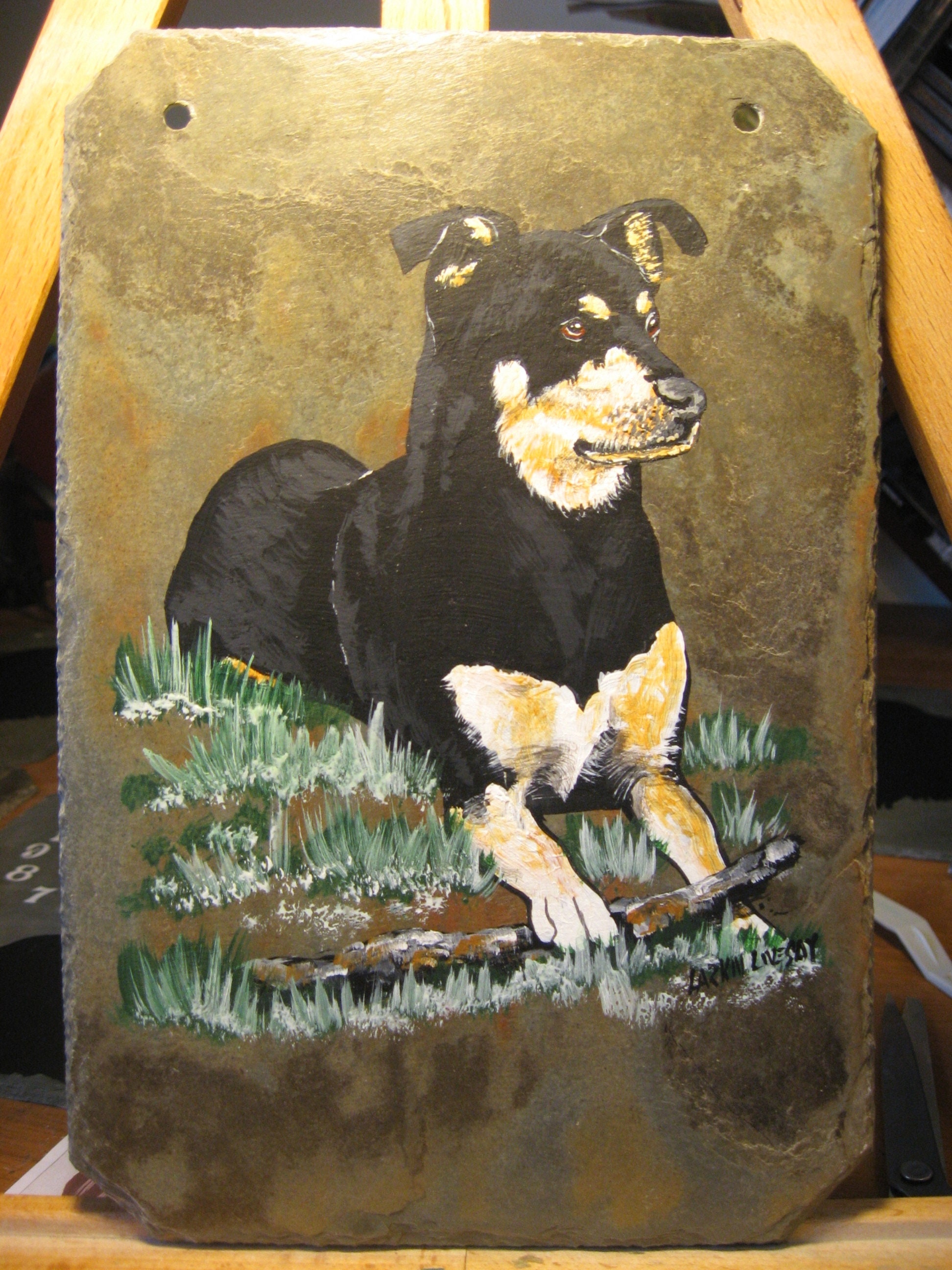 This particular tile is A hand painted portrait of your beloved pet. There is a space at the bottom for personalization, or can be left blank. If you would like 2 animals on the same slate, the slate will be in a horizontal position. These are perfect for showing your love for your fur babies as well as a memorial for your sweet friend.