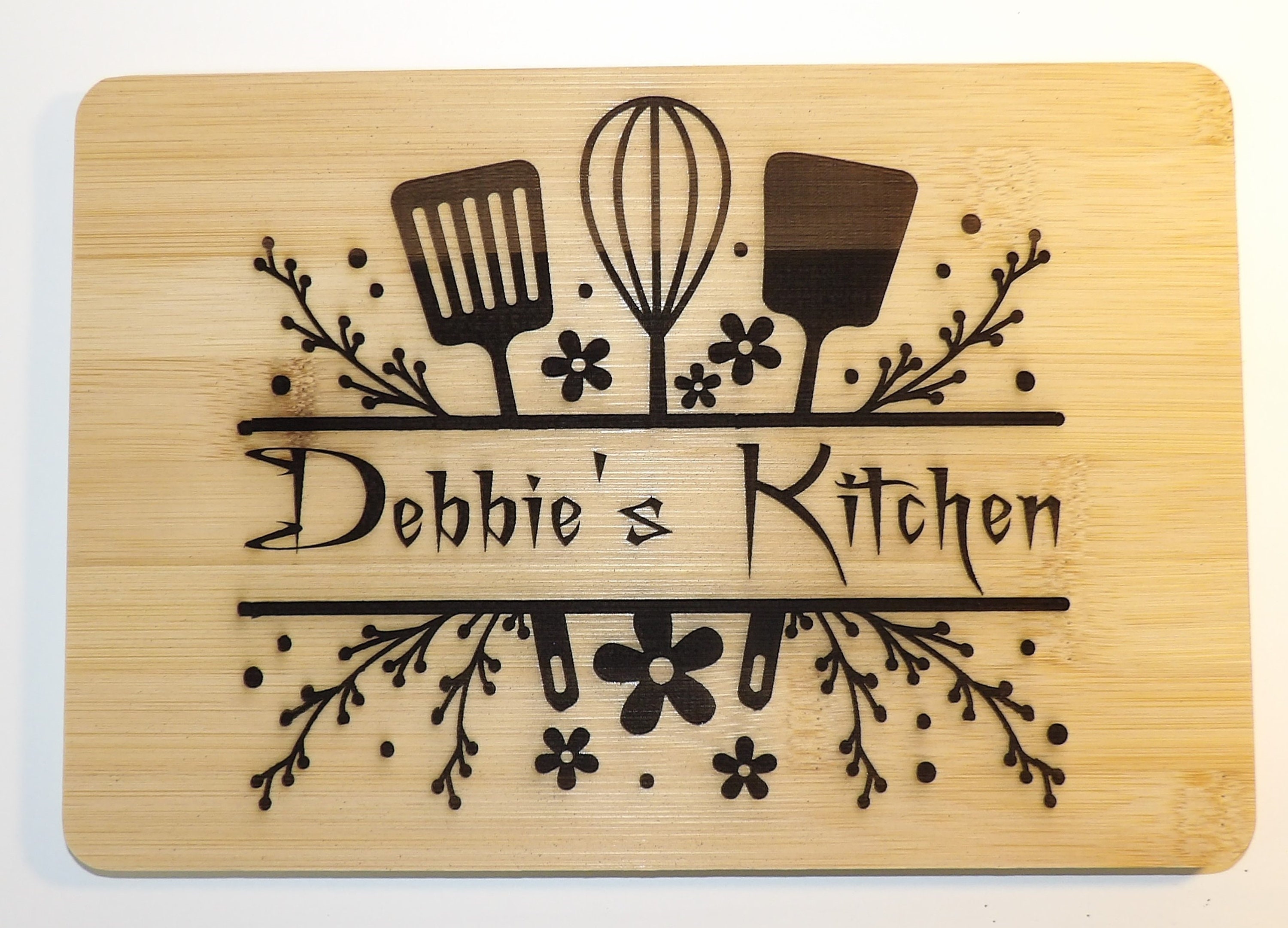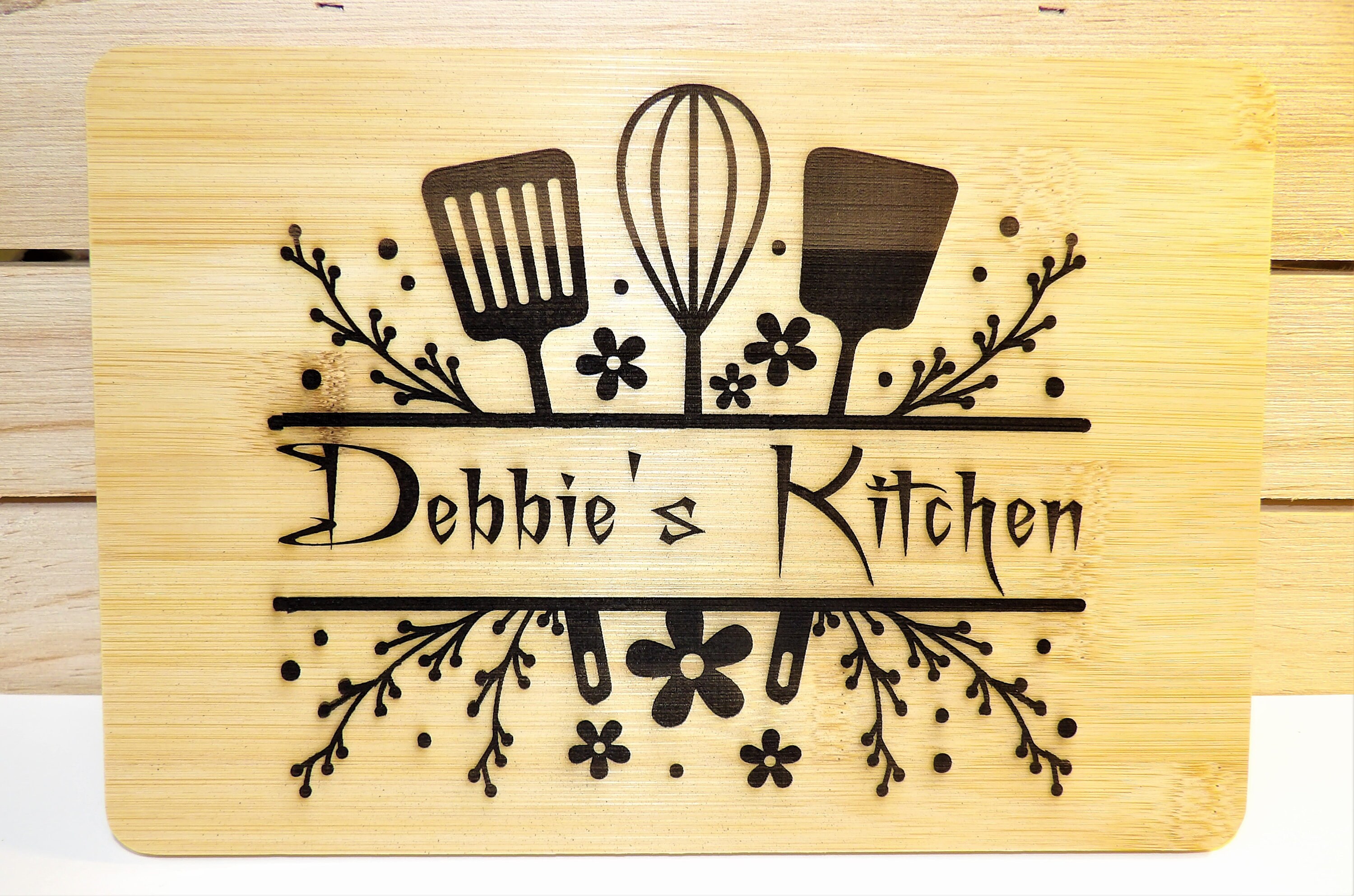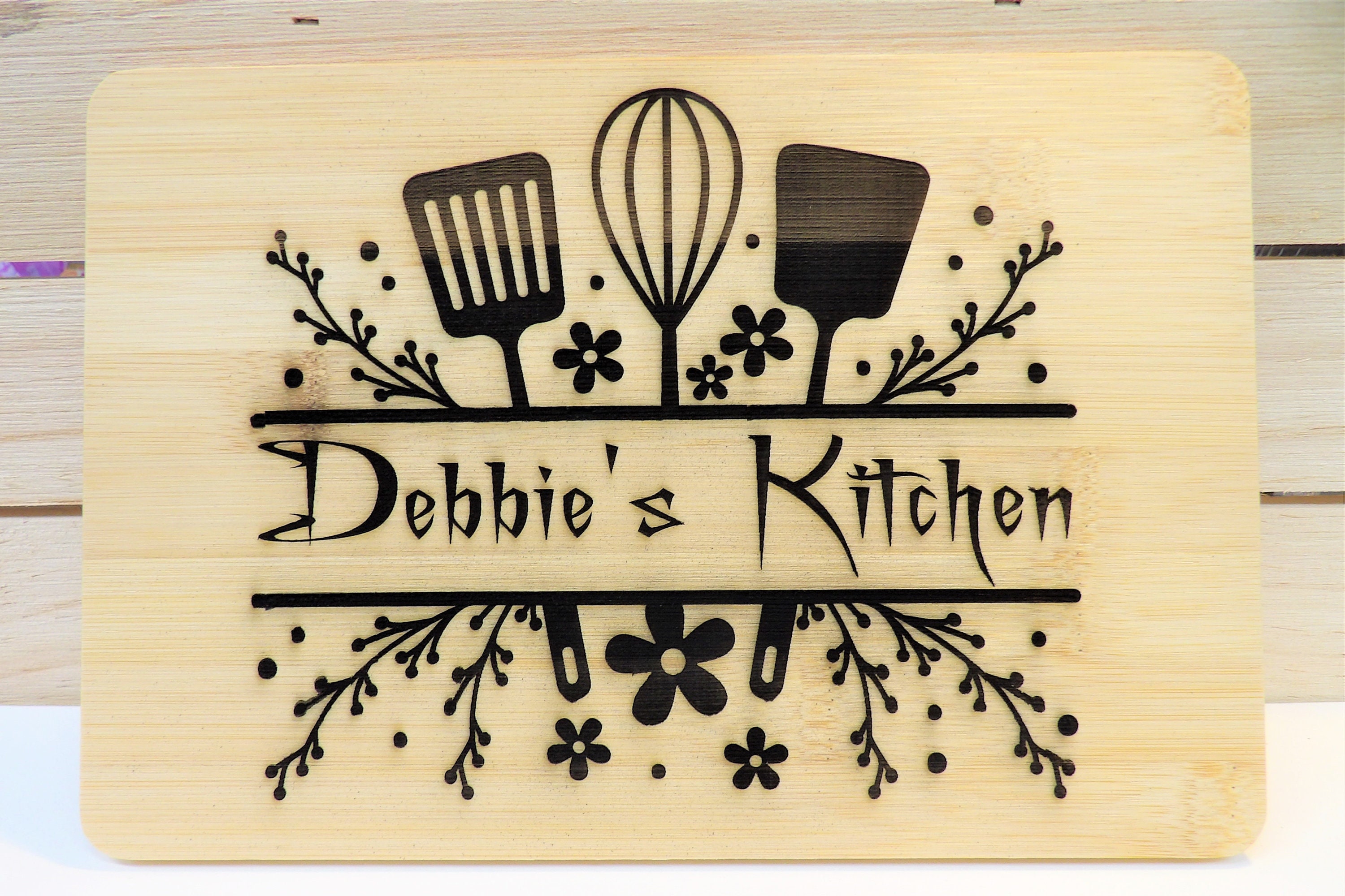 Use this 6" x 9" Bamboo board to show who's the boss in your kitchen! With beautiful flowers and kitchen utensils, this bamboo board adds a great addition to your farmhouse decor. Also looks good with modern themes.