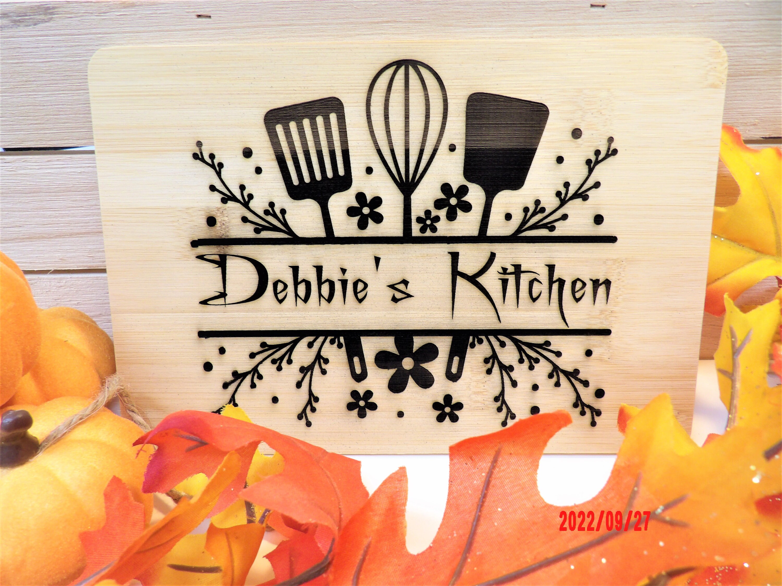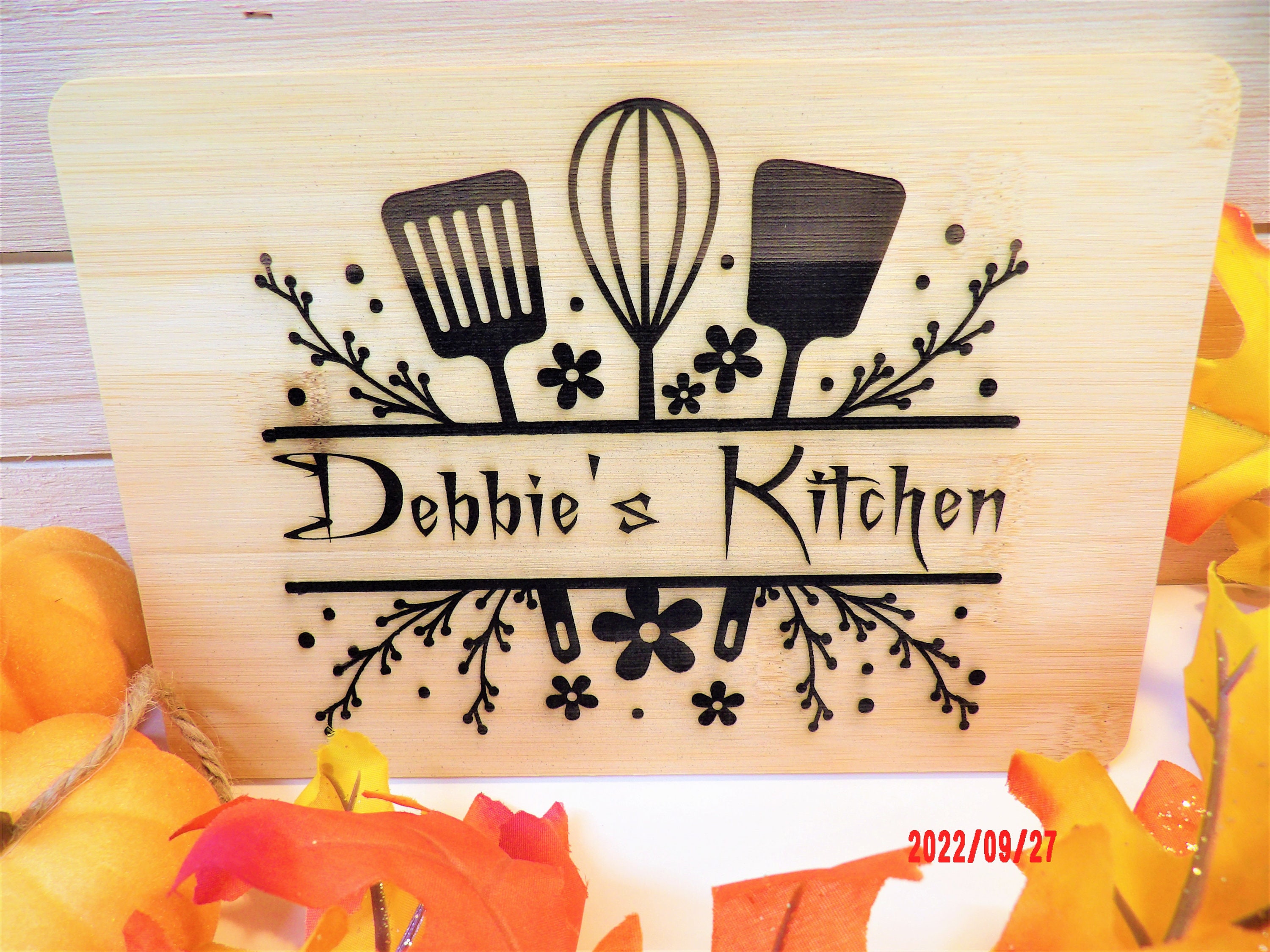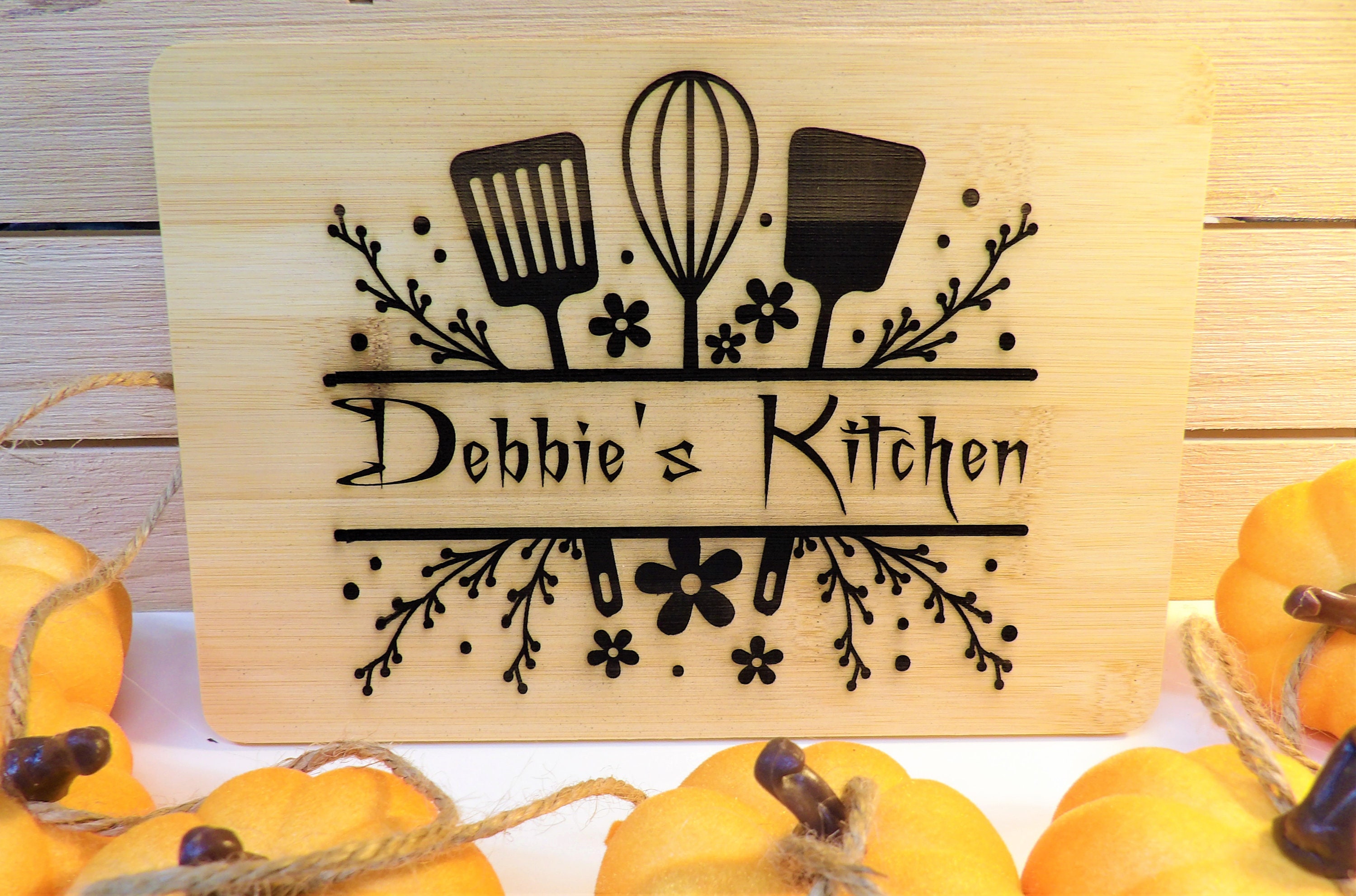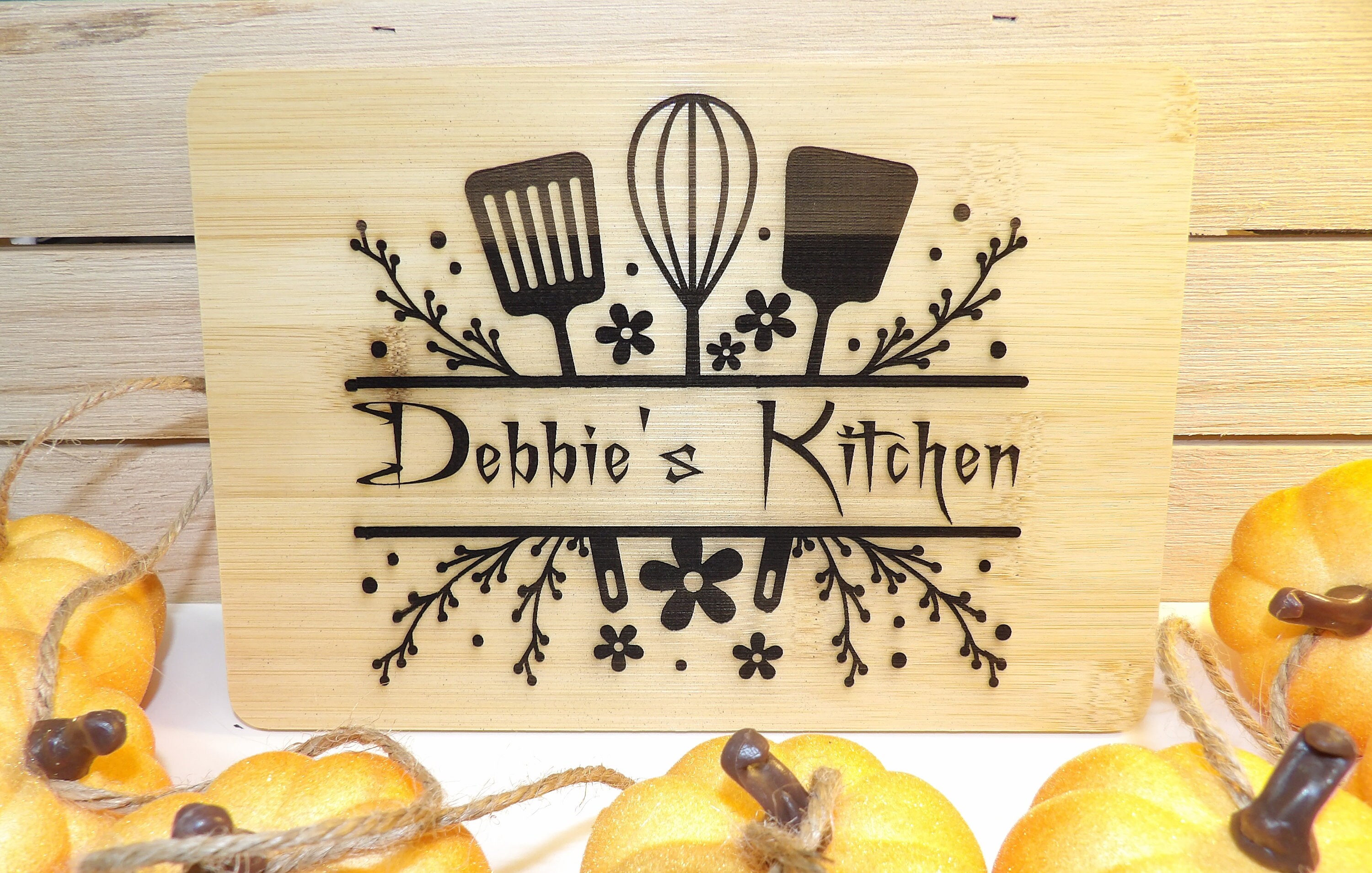 Use this 6" x 9" Bamboo board to show who's the boss in your kitchen! With beautiful flowers and kitchen utensils, this bamboo board adds a great addition to your farmhouse decor. Also looks good with modern themes.
