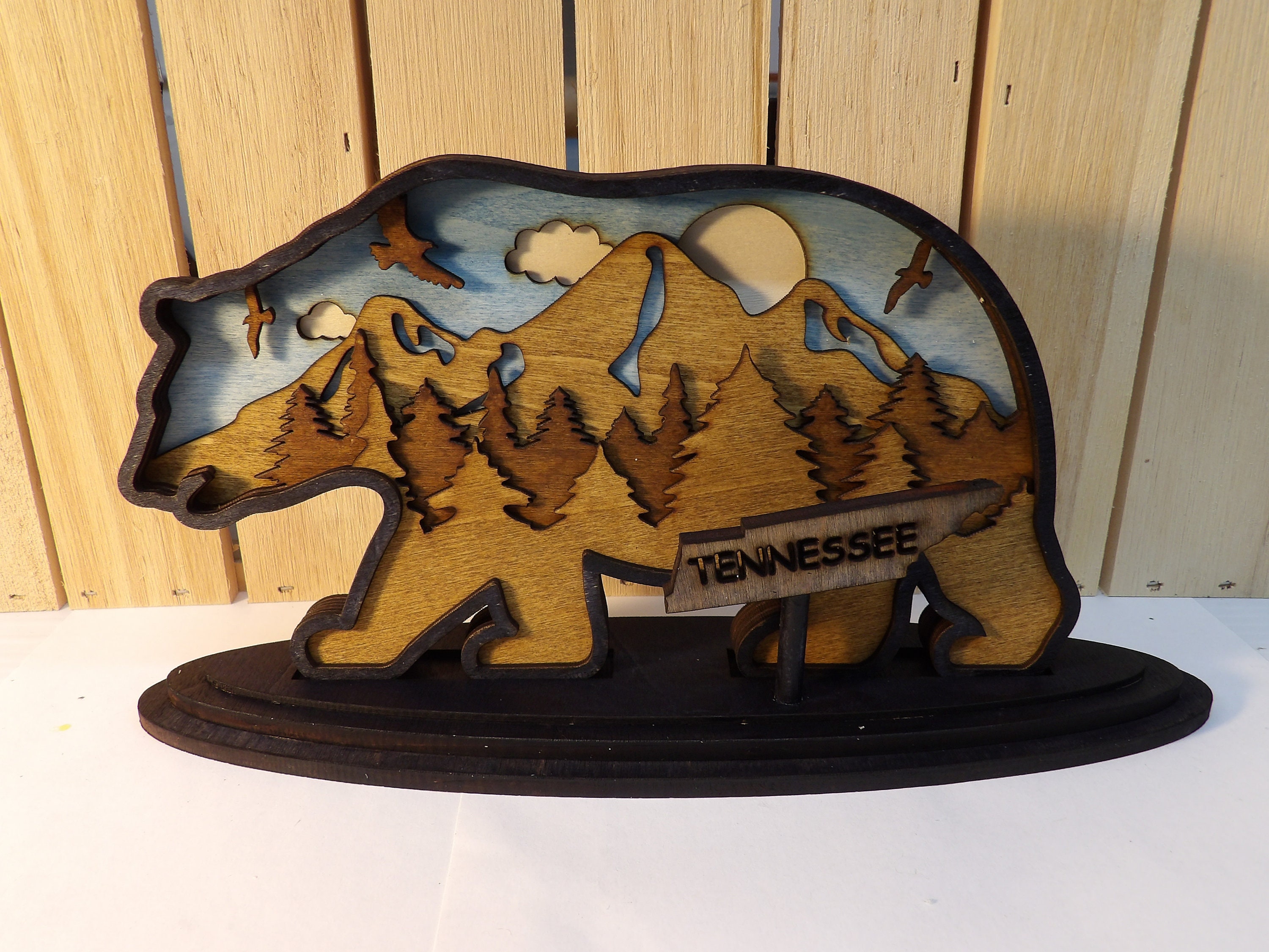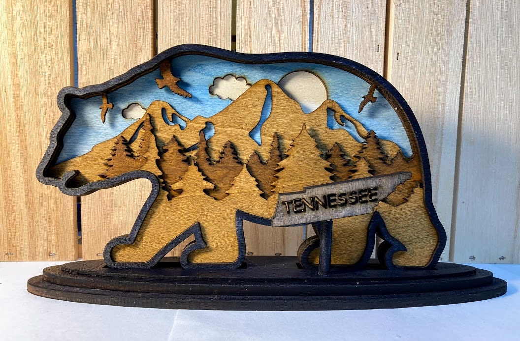 BEAR 3D SIGN - LASER CUT WOOD, STAINED, 6 LAYERS PLUS STATE SIGN AND STAND