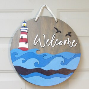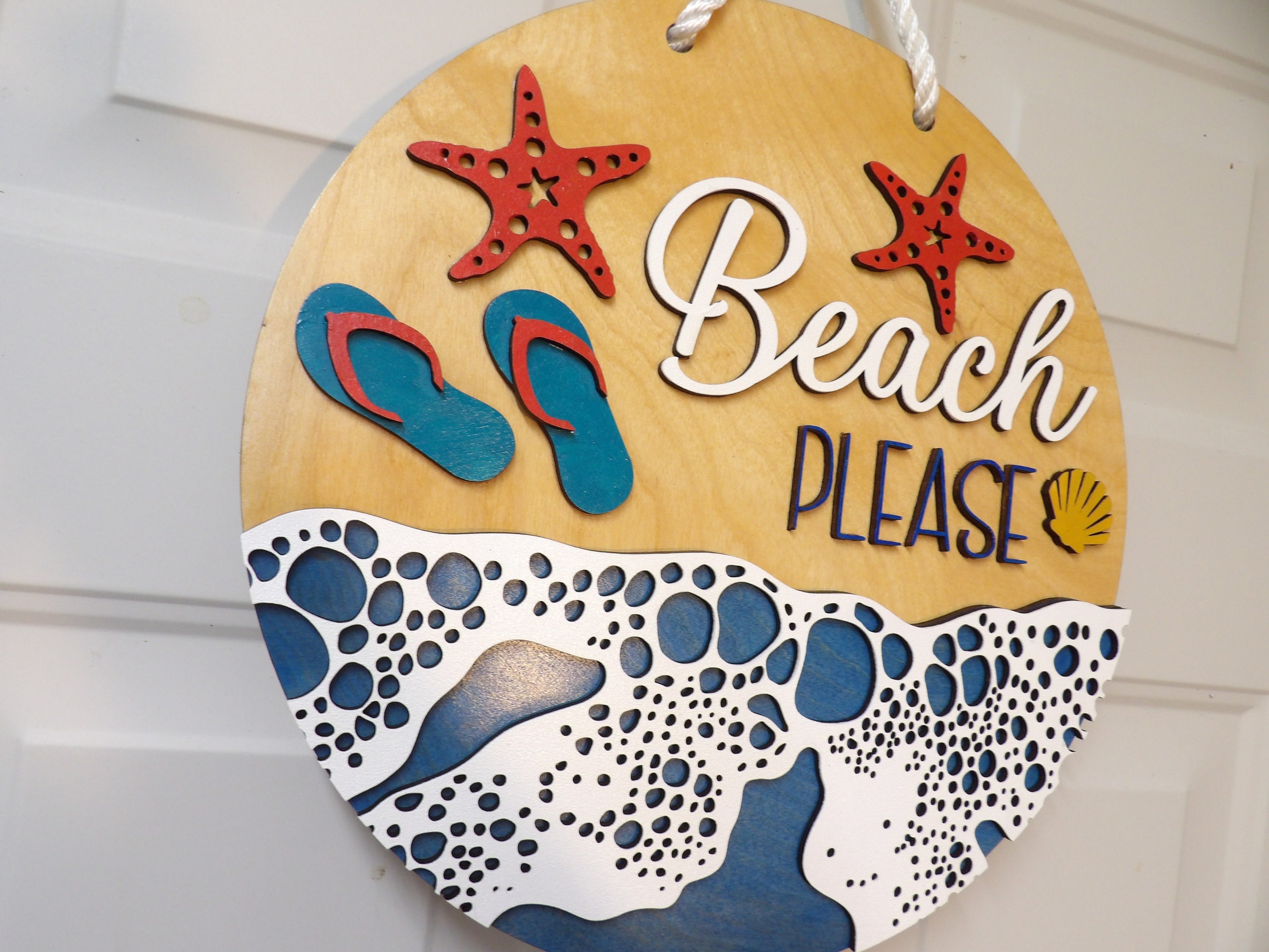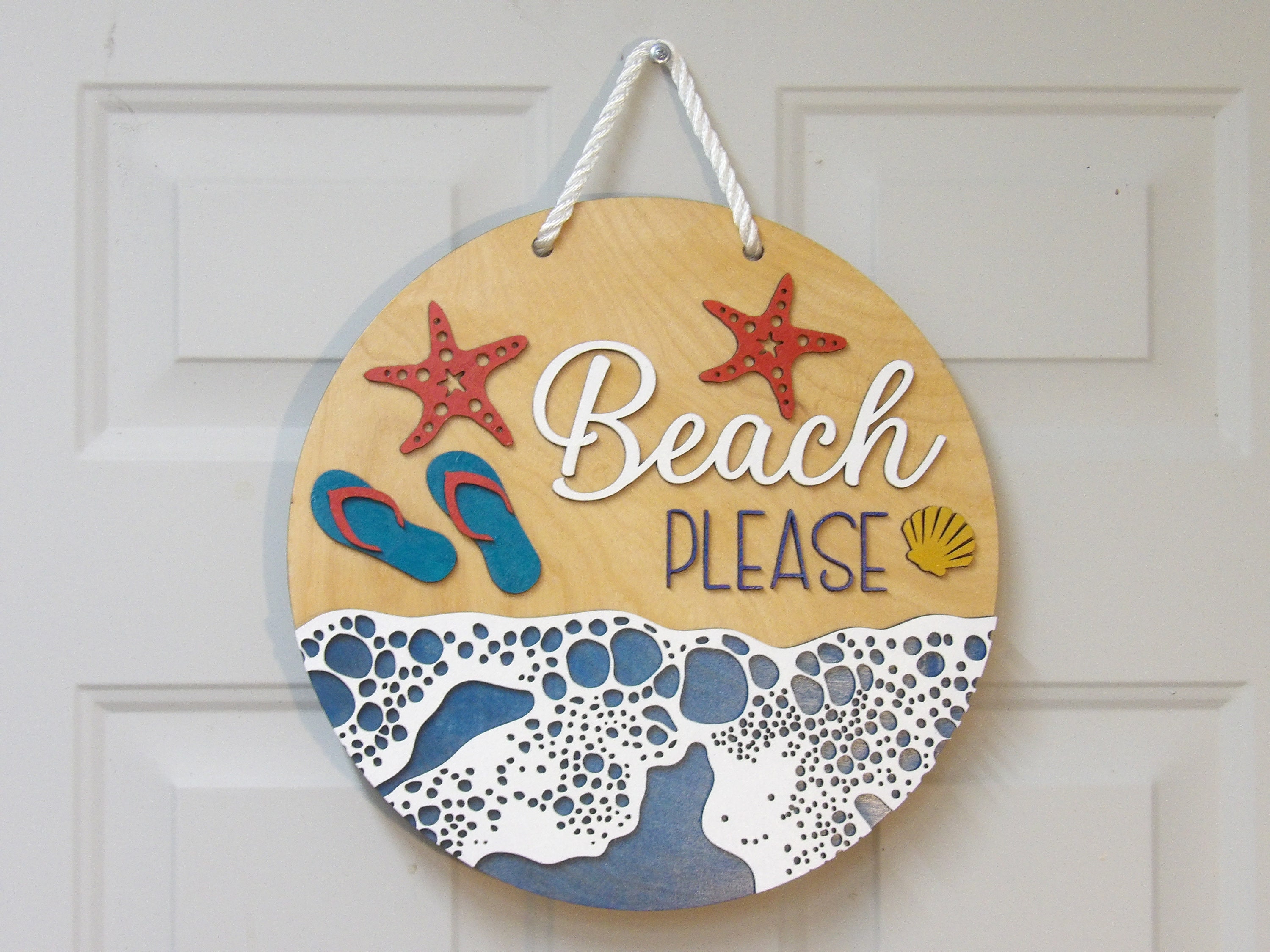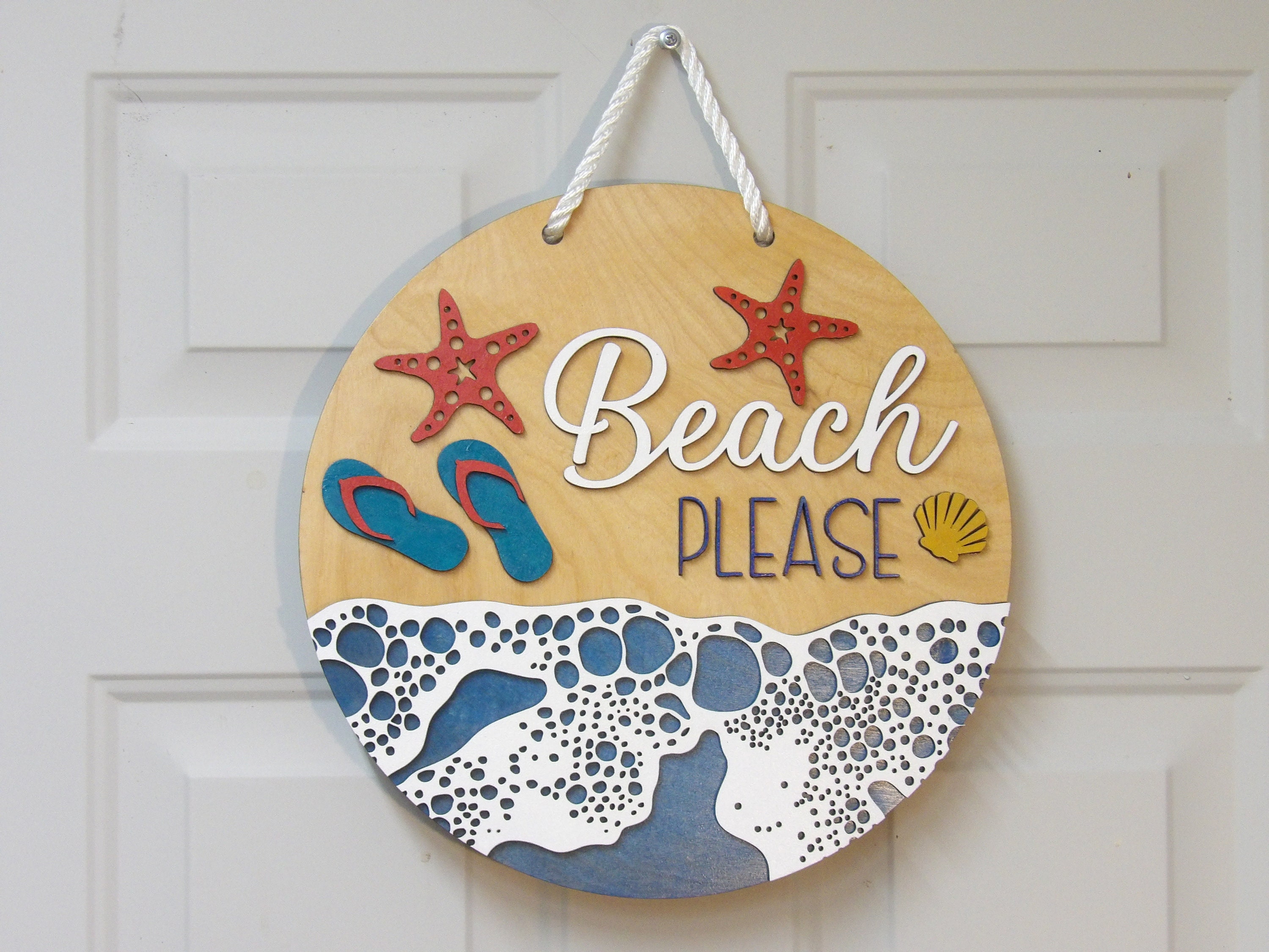 I make these wood signs in my shop in Morristown, TN. Made from 1/4" sustainable plywood, laser cut and hand painted. Clear coated for outdoor durability. Best for use under overhangs like a porch or awning. I have 2 of these in stock. Will make more as needed. Makes a beautiful way to welcome guests at the beach house or just an addition to your summer decor.