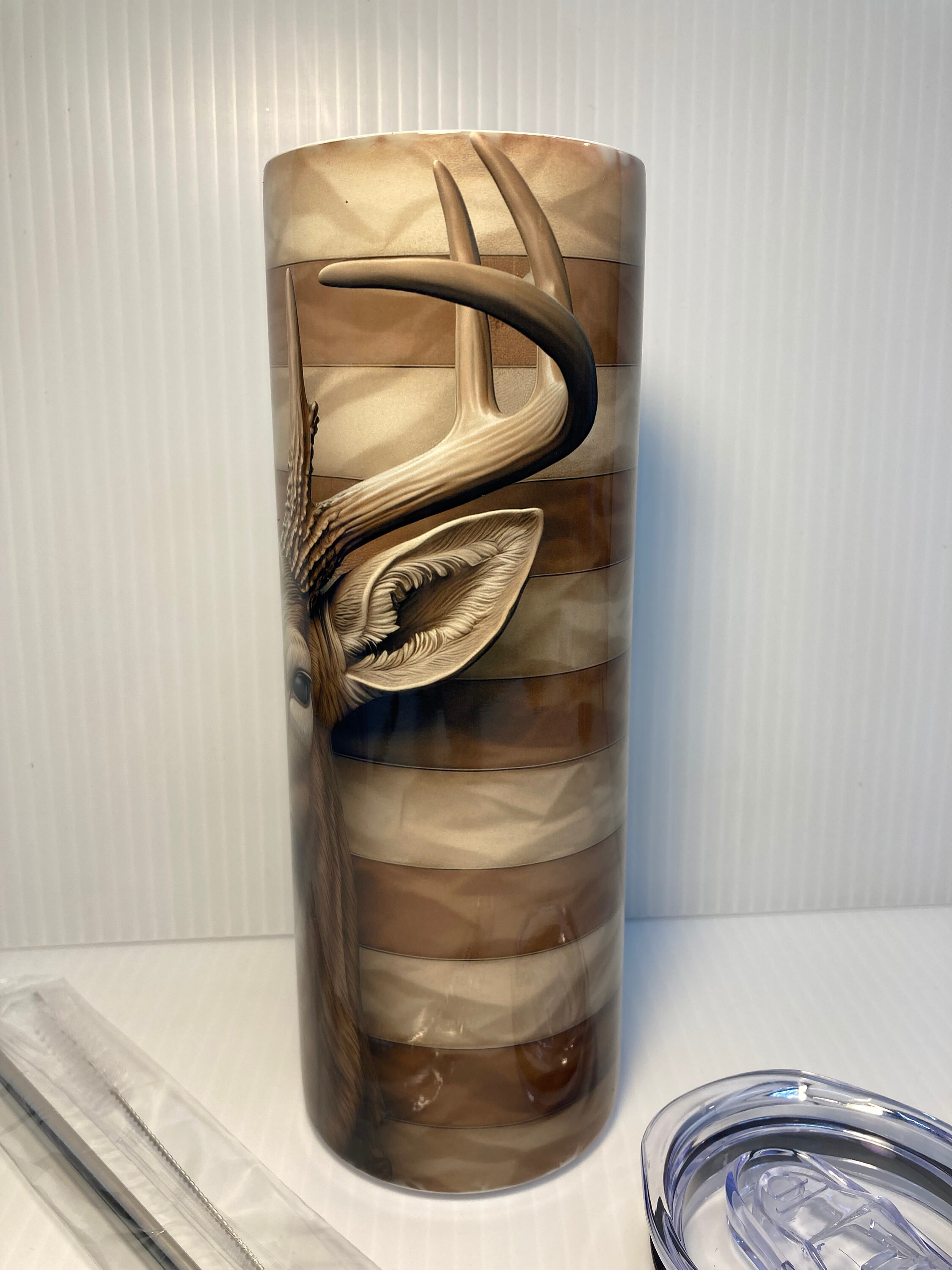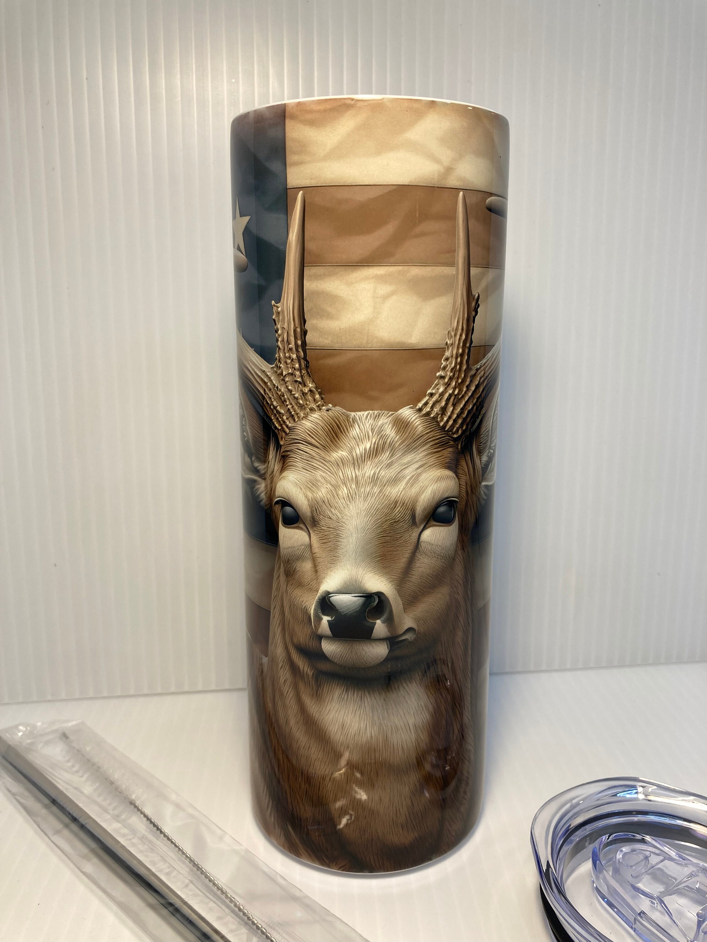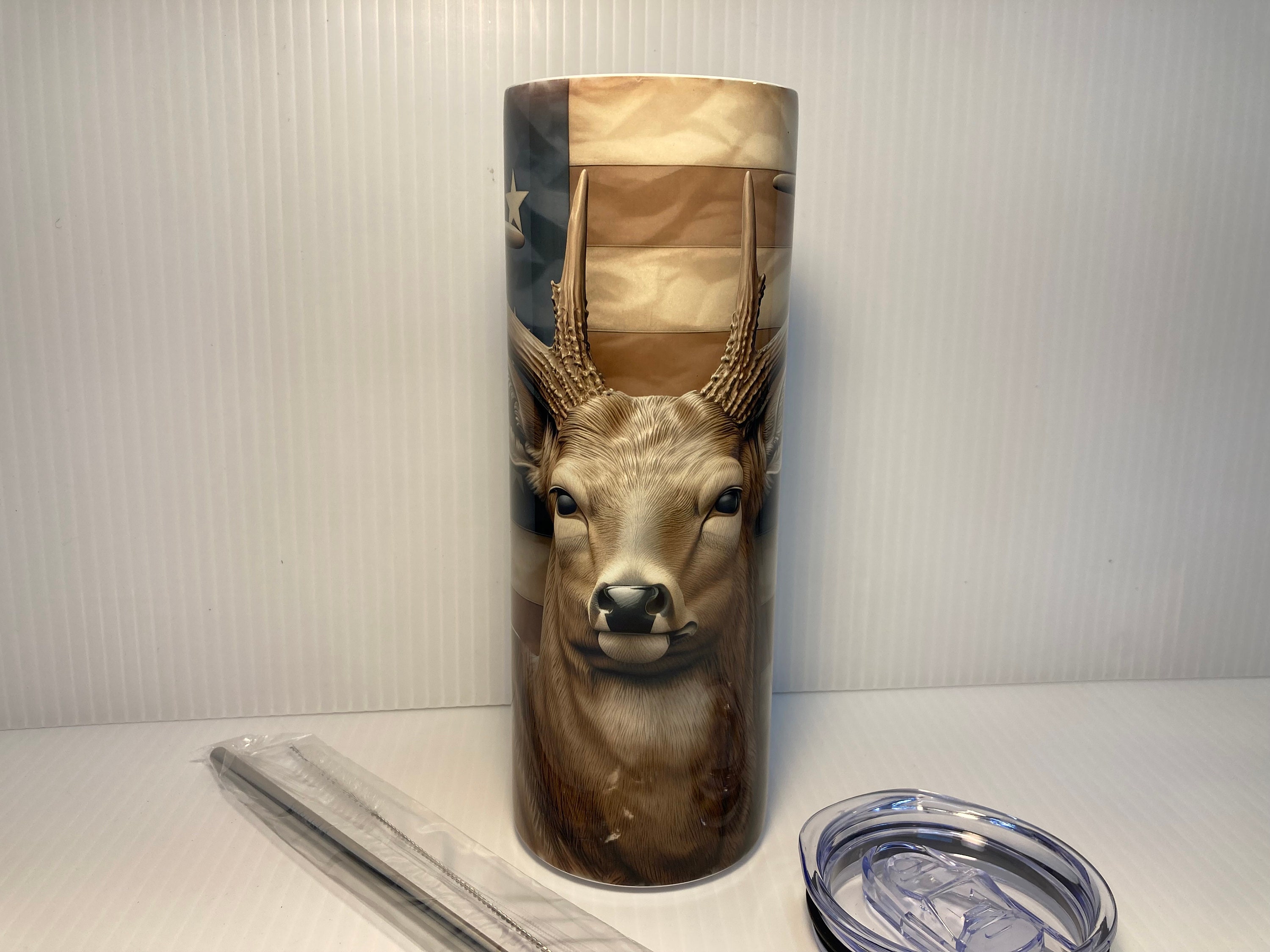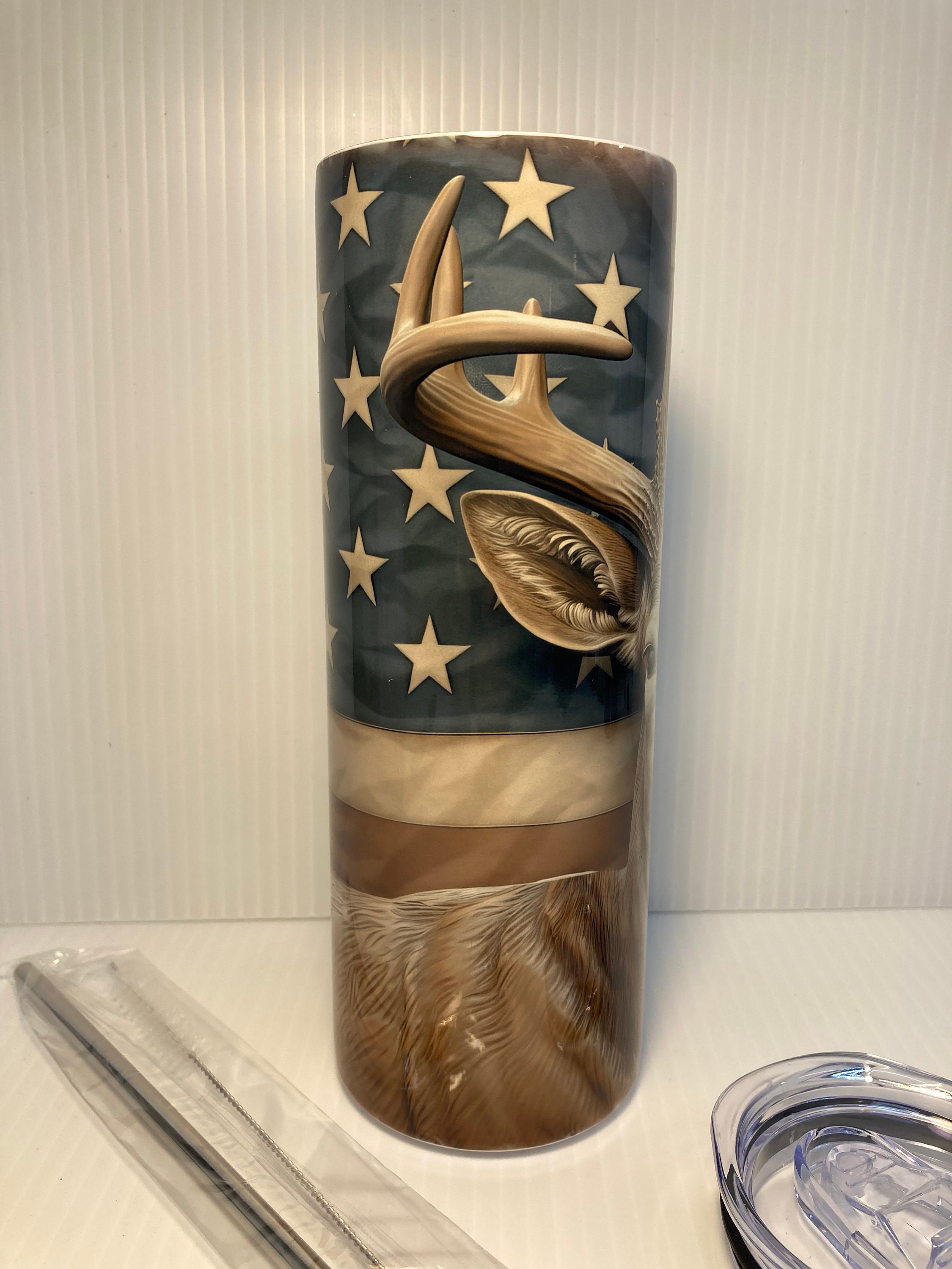 But that's not all! The 3D image on this tumbler showcases a majestic buck deer against an inspiring American flag background, adding a touch of patriotism and elegance to your drinkware collection.