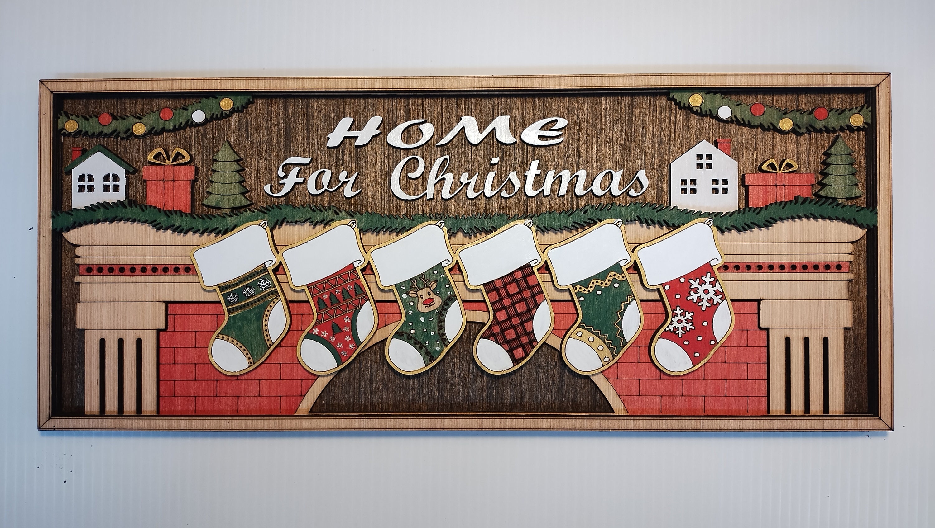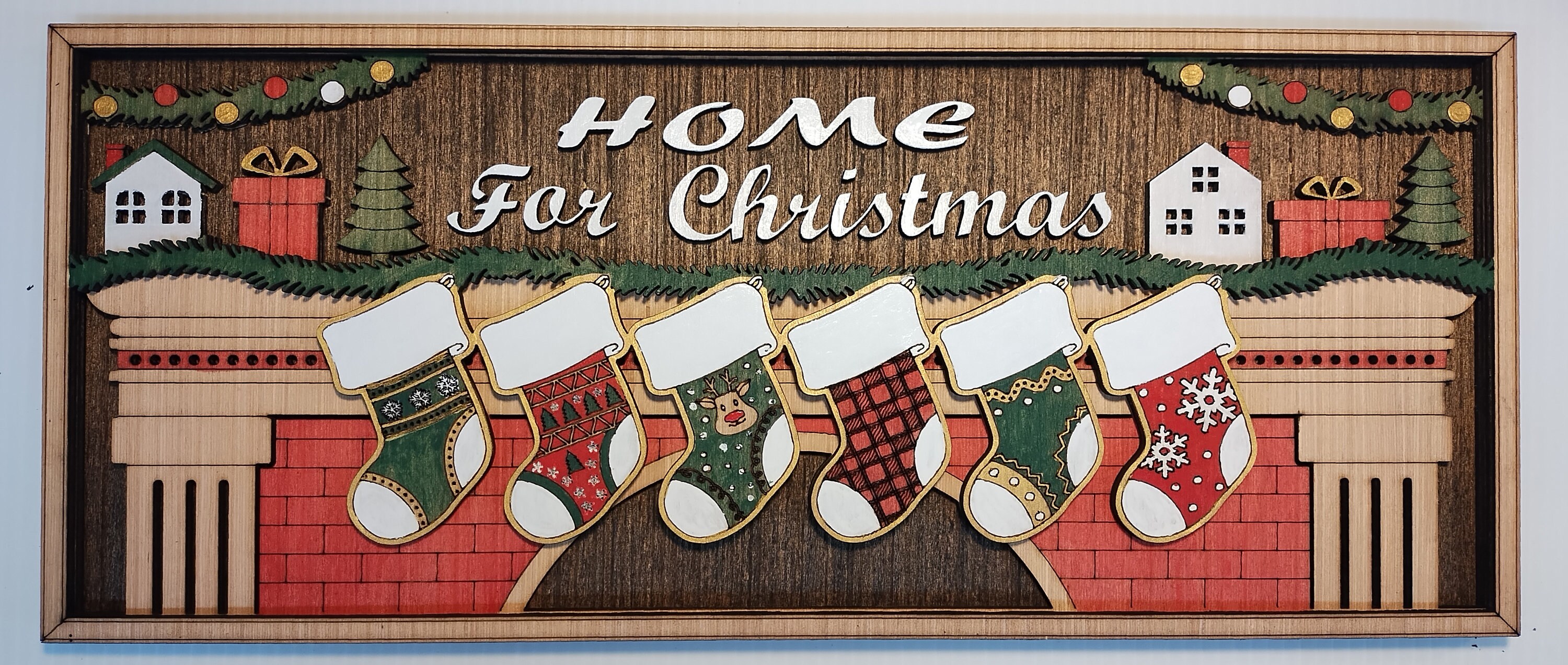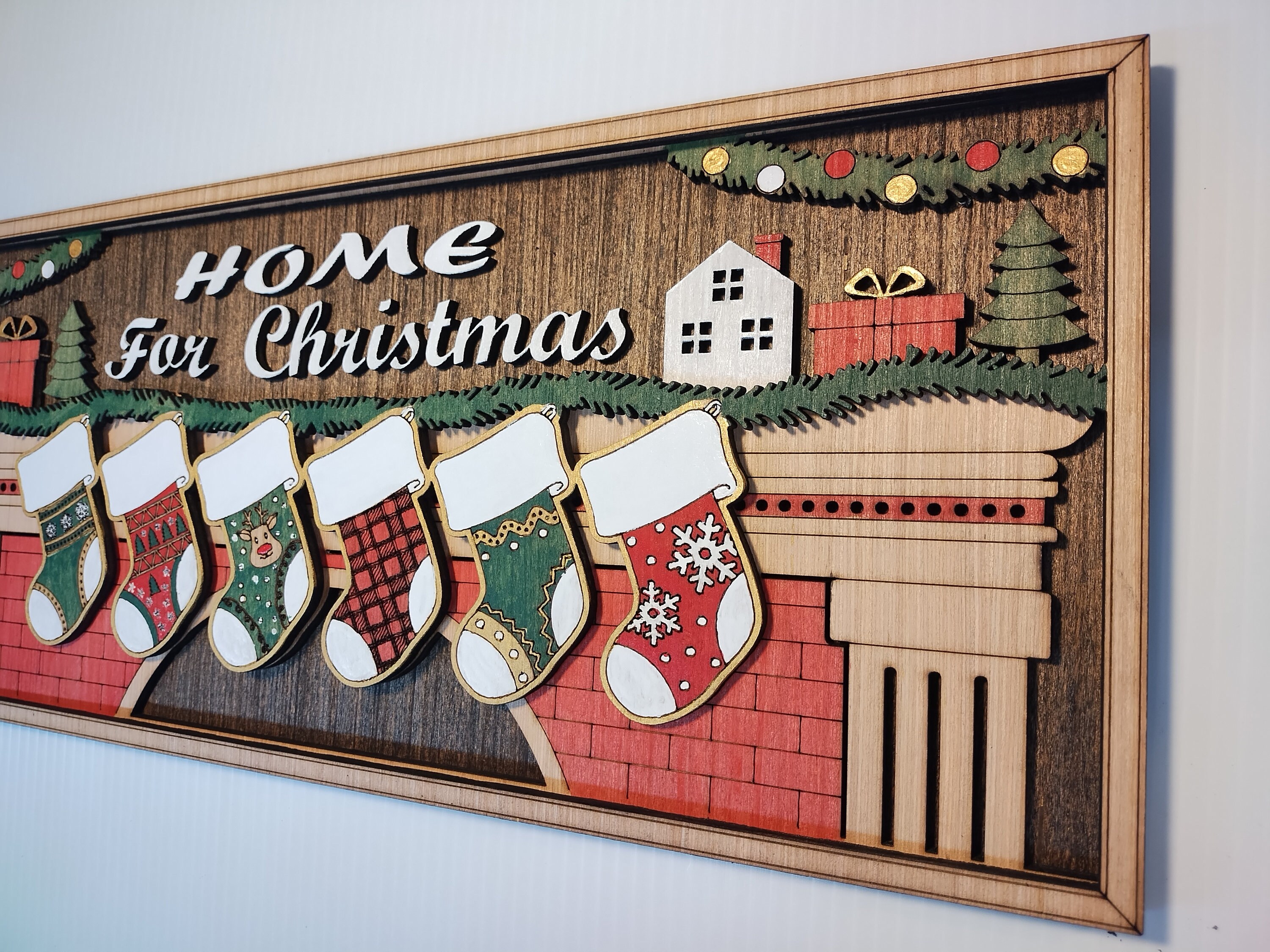 Make your home feel extra cozy this holiday season with our Home for Christmas personalized sign. This beautiful sign is made of laser-cut wood, stained and hand-painted to perfection. The sign features an image of a warm fireplace with hanging stockings, and you can choose to have 2 to 8 stockings, each personalized with your family members’ names. The main area above the fireplace can say “Home for Christmas” or be customized with your family name.