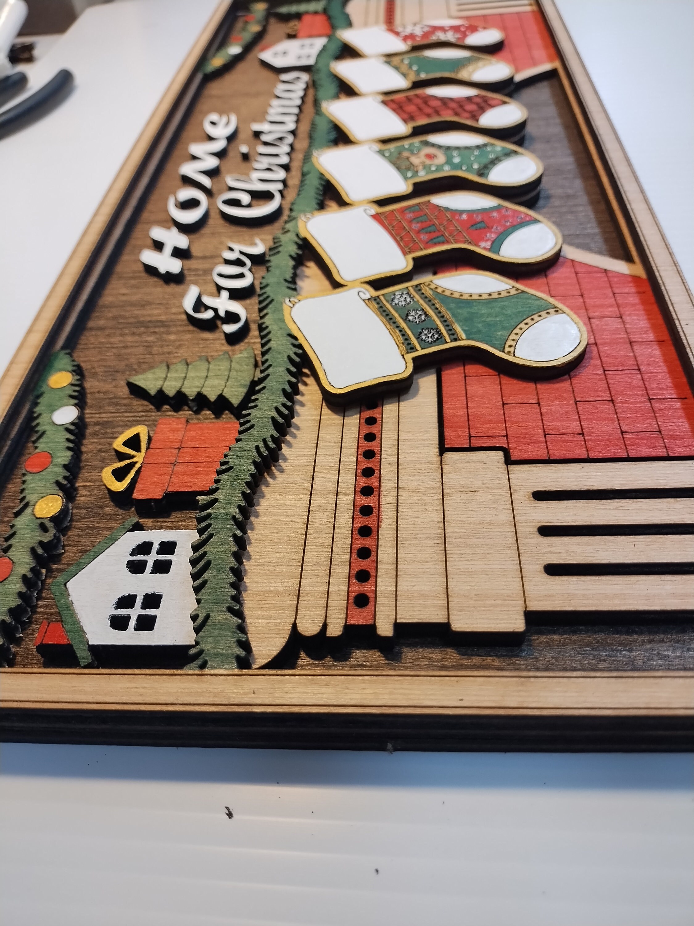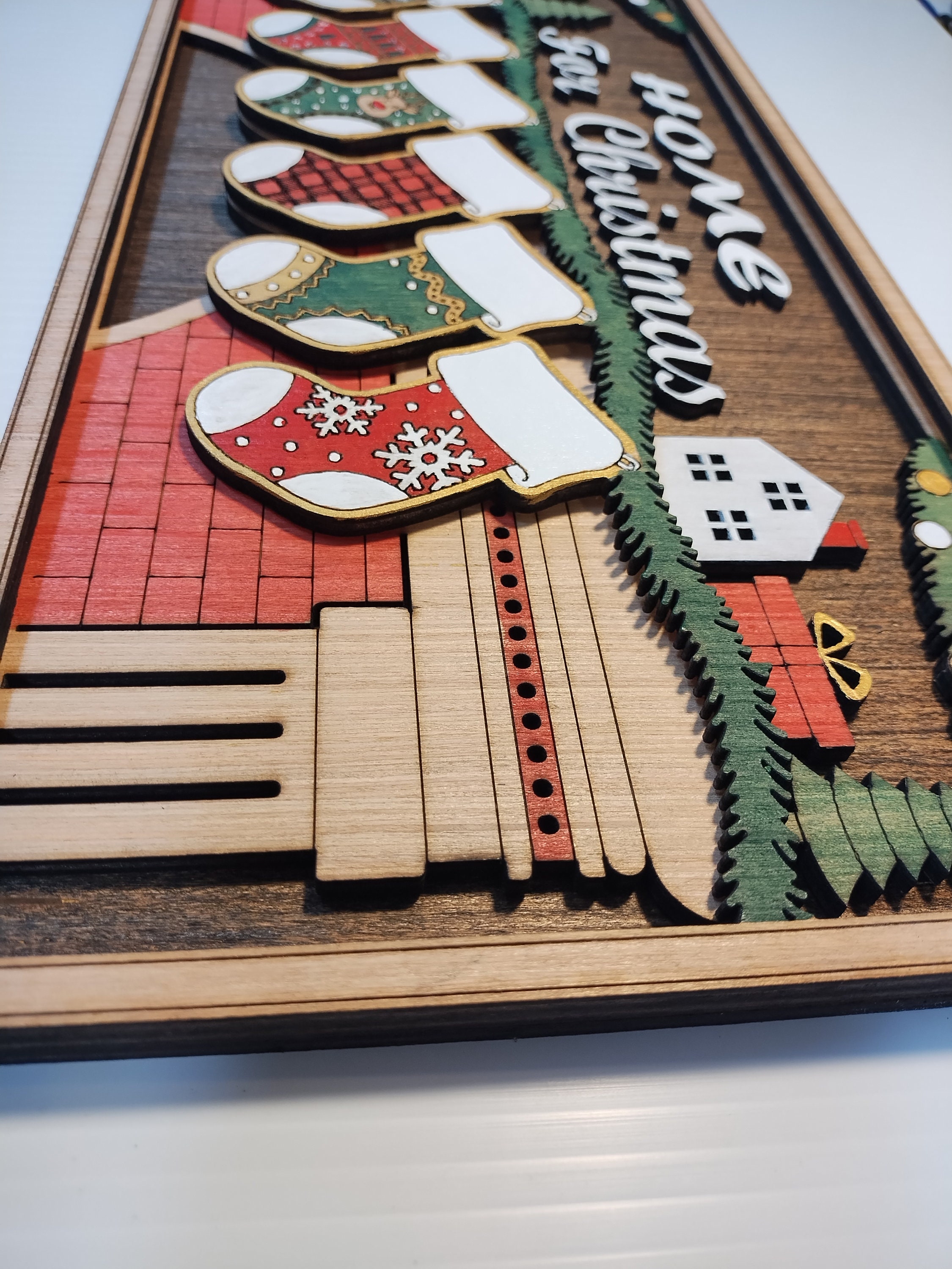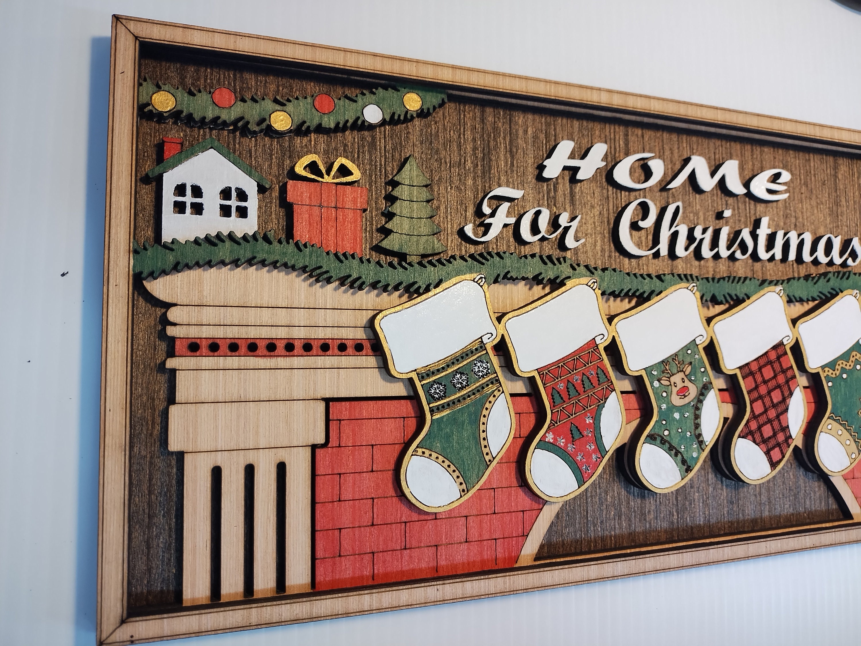 Make your home feel extra cozy this holiday season with our Home for Christmas personalized sign. This beautiful sign is made of laser-cut wood, stained and hand-painted to perfection. The sign features an image of a warm fireplace with hanging stockings, and you can choose to have 2 to 8 stockings, each personalized with your family members’ names. The main area above the fireplace can say “Home for Christmas” or be customized with your family name.