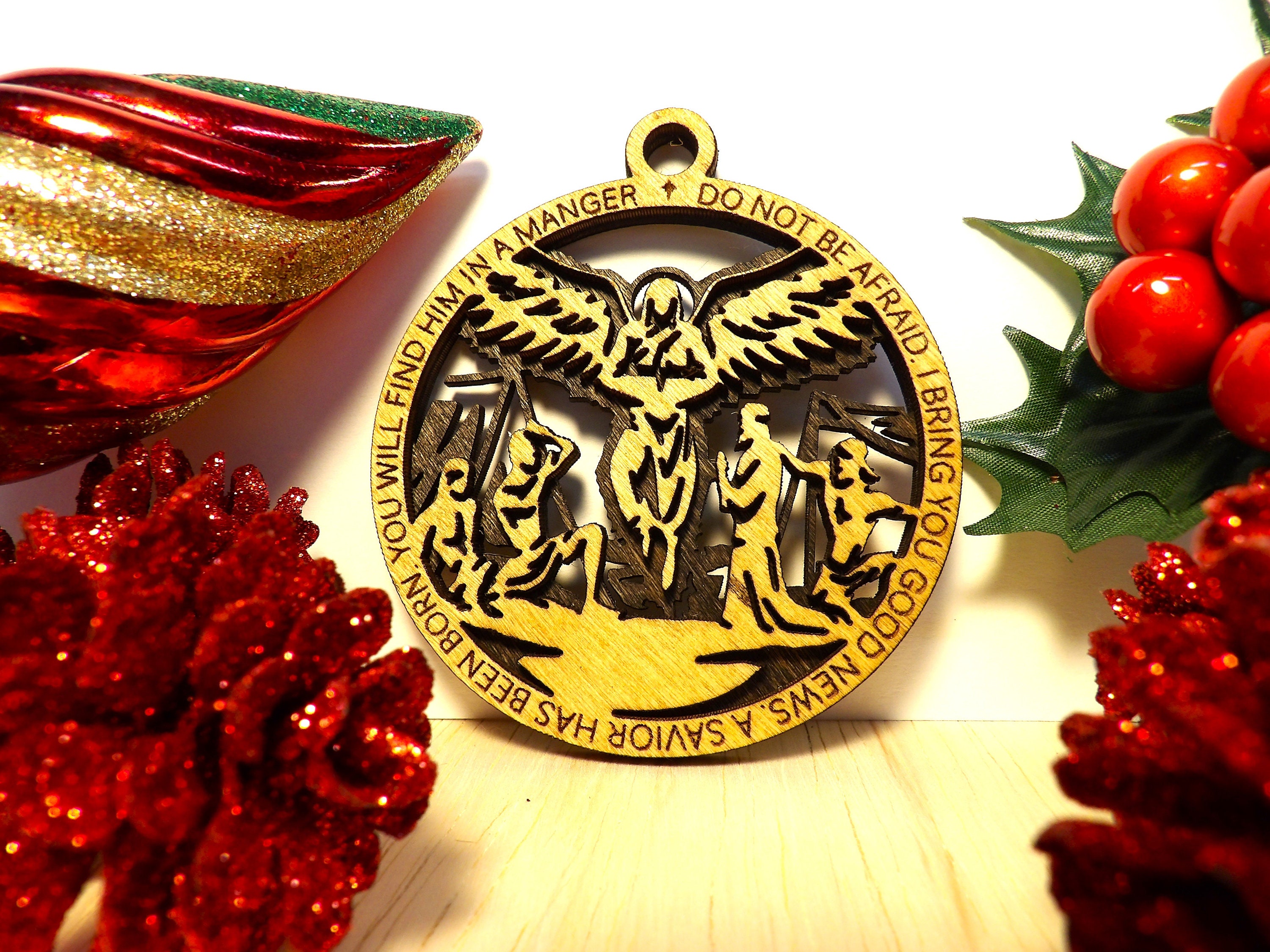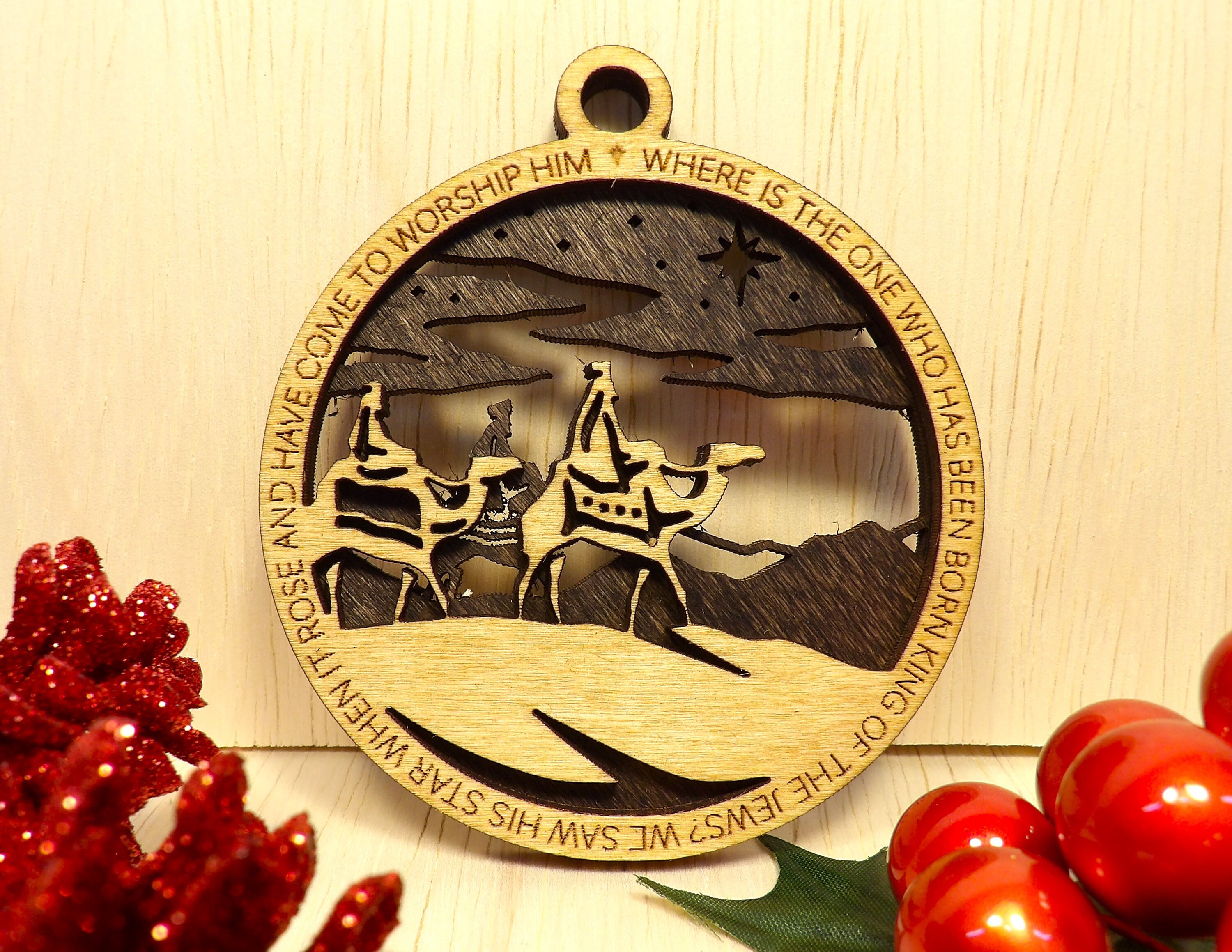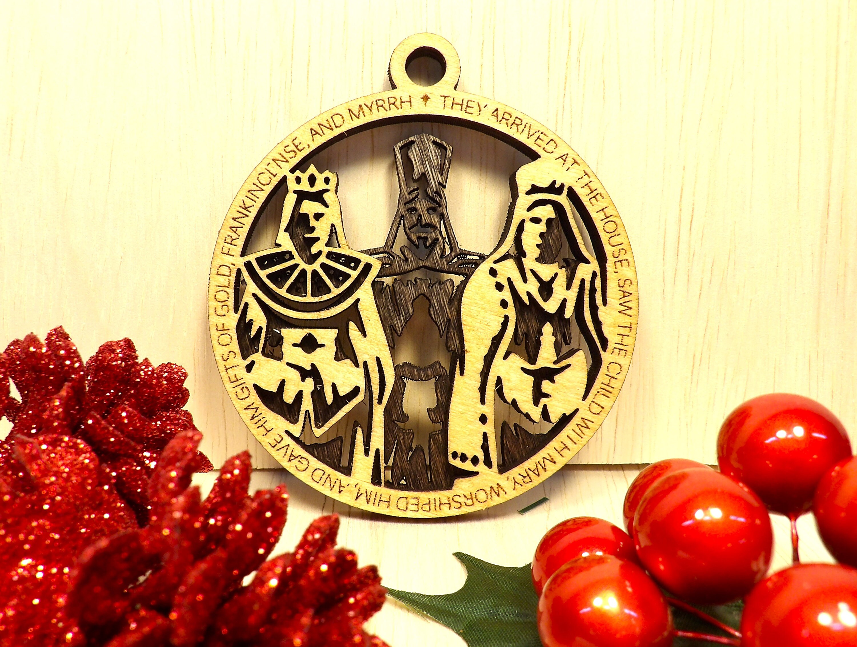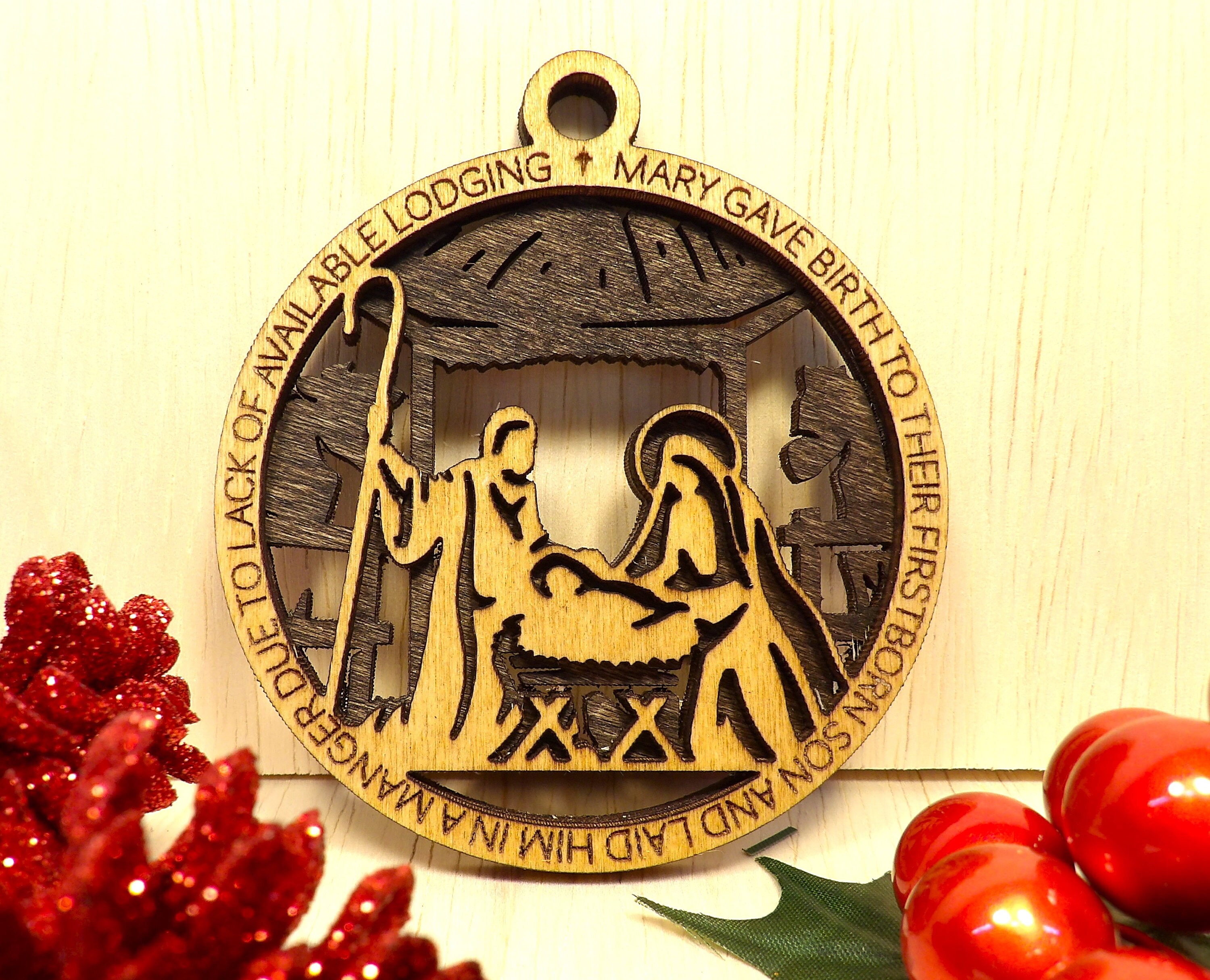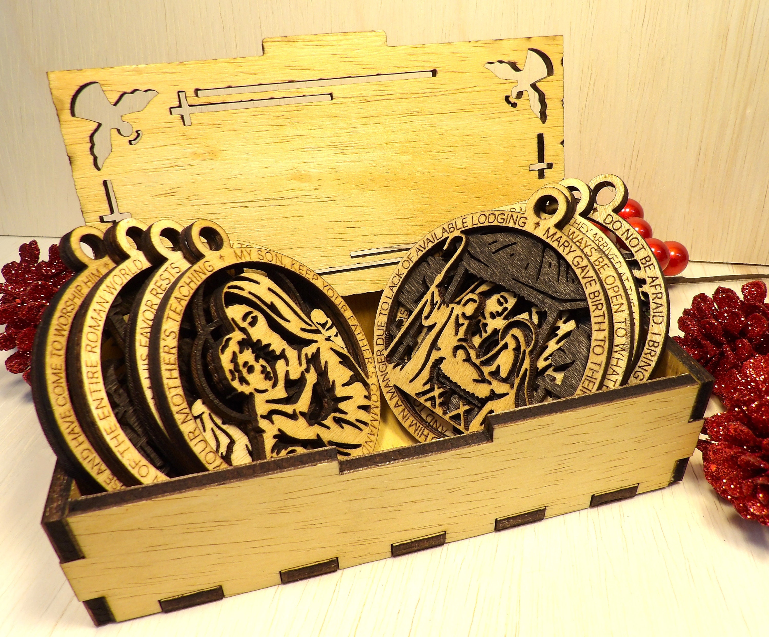 This set includes eight hand-crafted ornaments, each one laser cut from wood and stained to perfection. Each ornament tells a different part of the story of the birth of Christ, from the journey to Bethlehem to the arrival of the three wise men.